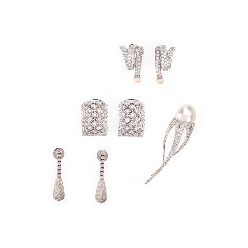 A collection of jewellery, comprising: a diamond and cultured pearl brooch, the drop-shaped cultured pearl below an openwork scrolling mount set with graduated round brilliant-cut diamonds, in white gold, stamped 18K, length 6.8cm; a pair of diamond and cultured pearl earrings, each with a scrolling surmount set with round brilliant-cut diamonds and suspending a cultured pearl, in white gold, clip fittings, length 2.8cm; a pair of diamond earrings, set with a row of round brilliant-cut diamonds suspending pavé-set diamond drops, in white gold, post fittings, length 3.4cm; and a pair of diamond earrings, decorated with an openwork lattice design set with round brilliant-cut diamonds between diamond-set borders, in white gold, clip fittings, length 2.6cm