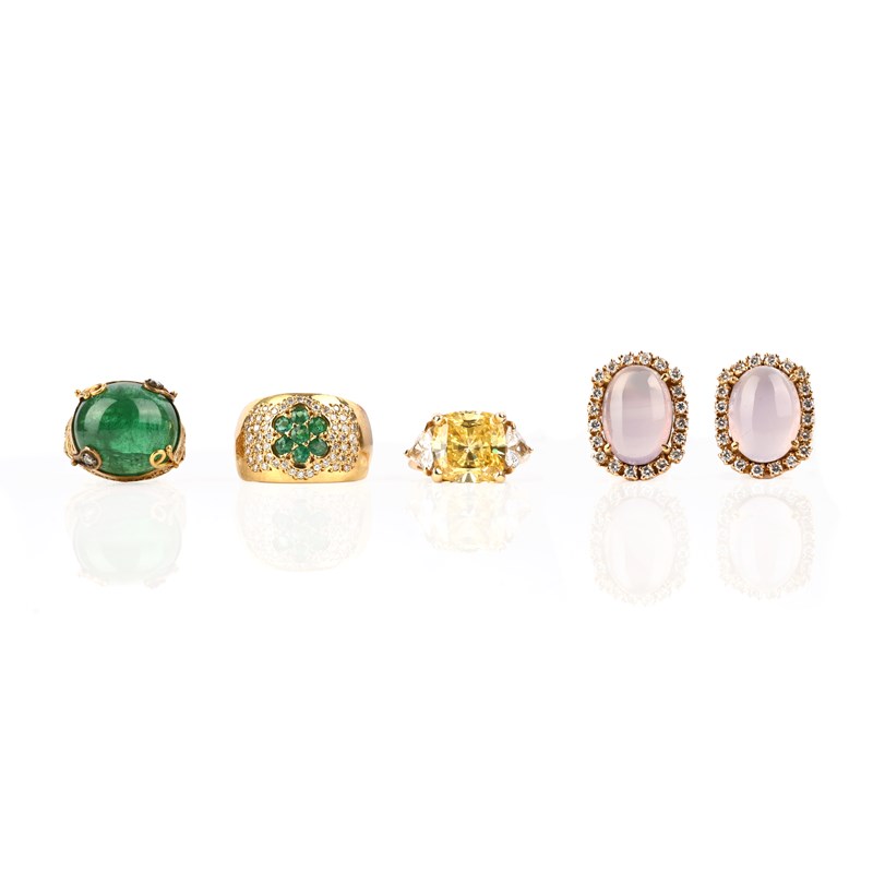 A collection of jewellery, comprising: a pair of rose quartz and diamond studs, each set with a rose quartz cabochon within a surround of round brilliant-cut diamonds, in yellow gold, length 1.8cm; an emerald and diamond ring of bombé design, centred with a stylised floral motif of circular-cut emeralds within a surround of round brilliant-cut diamonds in yellow gold, stamped 750, size M; an emerald ring, set with an oval emerald cabochon in an openwork surround accented with diamonds, size N; and a three-stone ring, set with simulant diamonds, in yellow gold, stamped 14K, size L