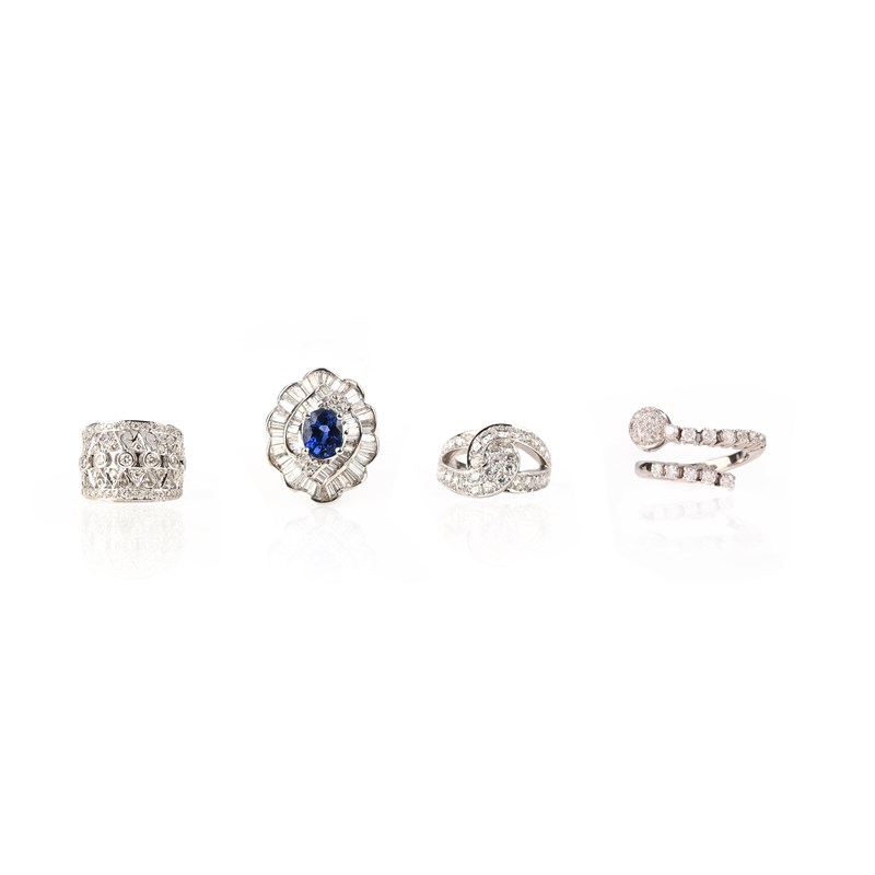 A collection of four gem set rings, comprising: a sapphire and diamond cluster ring, the oval-shaped sapphire within two concentric ballerina surrounds of baguette-shaped and round brilliant-cut diamonds, in white gold, size N; Mouawad, a diamond ring of interlocking link design, set with round brilliant-cut diamonds, in white gold, stamped 750 and Mouawad, size M; a diamond ring of openwork design set with a row of round brilliant-cut diamonds with a pavé-set terminal, in white gold, stamped 750, size O; and a diamond ring of openwork design set with round brilliant-cut diamonds, in white gold, size approx N 1/2