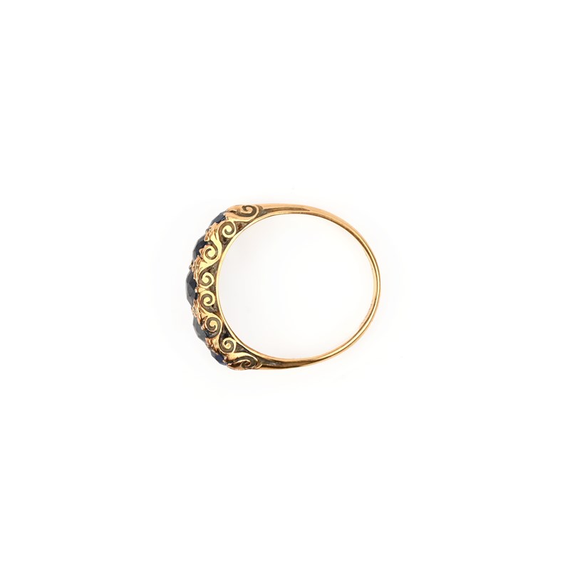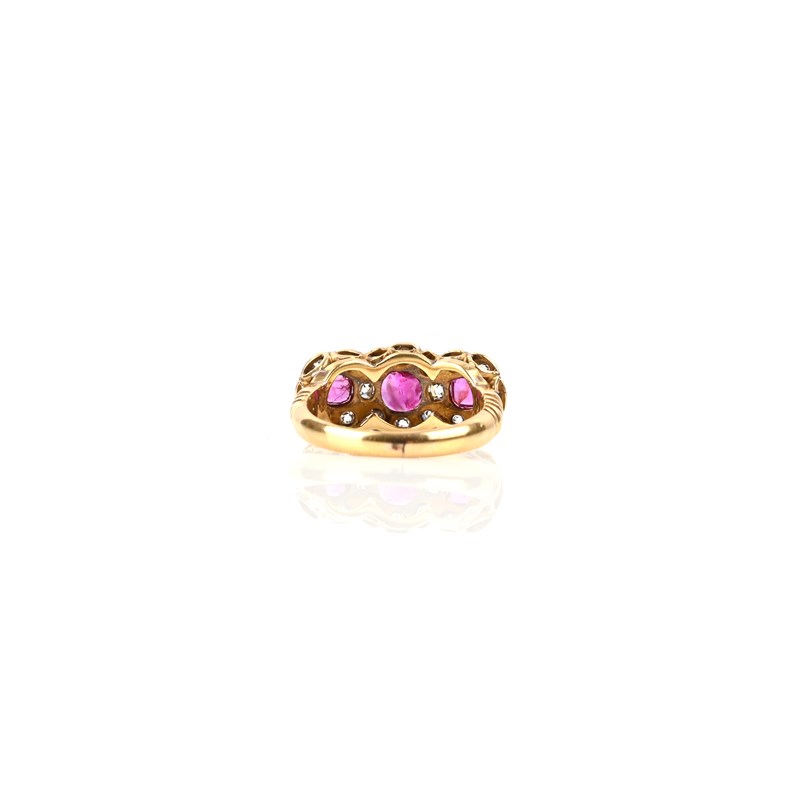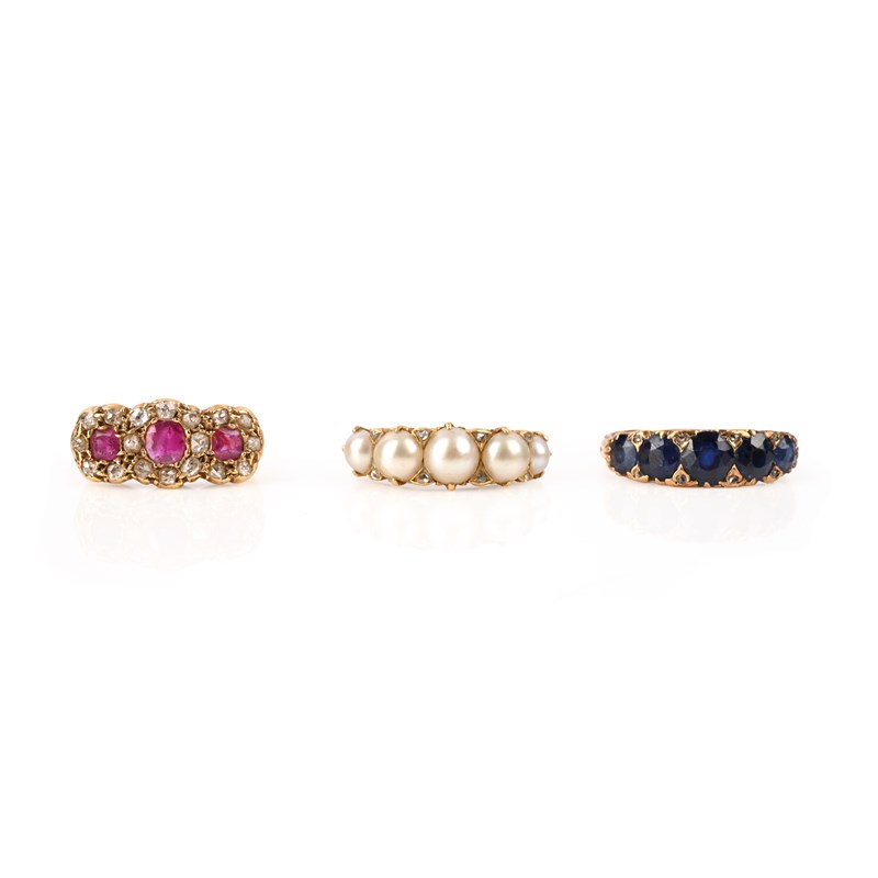 Three 19th century gold rings, comprising: an 18ct gold ring set with three graduated cushion-cut rubies within borders of smaller diamonds, London hallmarks, size J; a gold ring set with five graduated circular-sapphires in a carved mount accented with diamonds, size P; and a gold ring set with graduated half-pearls in a scrolling mount accented with diamonds, size N