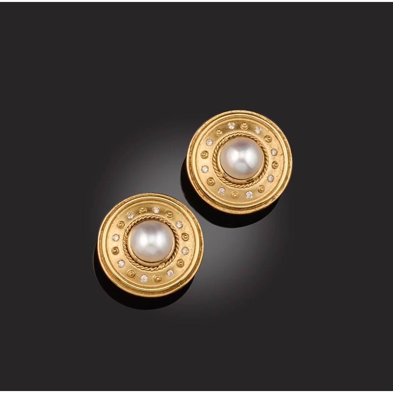A pair of mabé cultured pearl, gold and diamond earrings, each centring on a cultured mabé pearl,