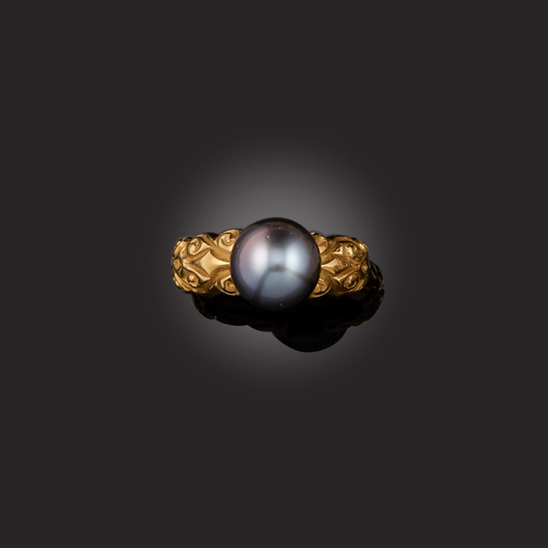 A cultured pearl ring, set with a black cultured pearl measuring 9.3mm, to a gold mount of scrolled