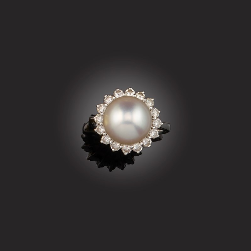 A cultured pearl and diamond ring, of cluster design, set with a cultured pearl measuring 11.6mm diameter, within a border of brilliant-cut diamonds, mounted in white gold, size M1/2, stamped 750