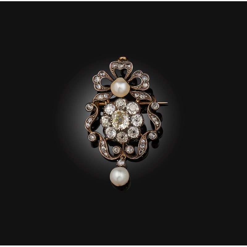 A diamond and pearl brooch, late 19th century, centring on a cluster of cushion-shaped diamonds, within a foliate scroll border surmounted by a bow and suspending a pendant, set with rose-cut diamonds and two pearls, mounted in silver and gold, length 4.1cm, detachable brooch fitting, retractable pendant hoop, pearls untested
