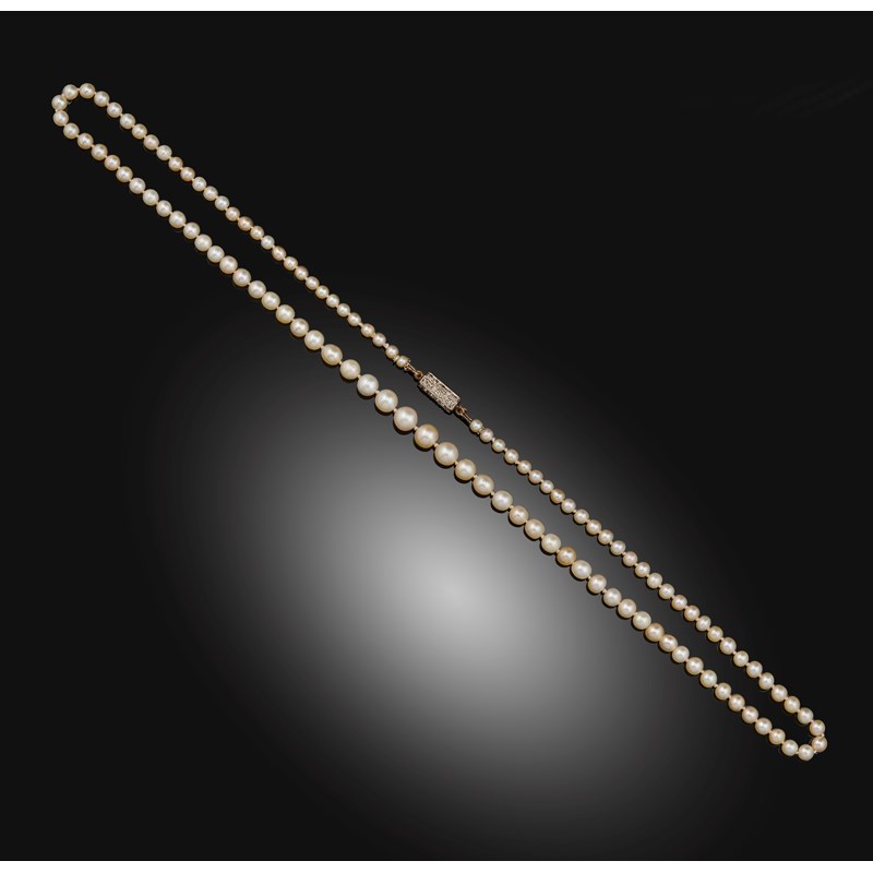 A single row natural pearl necklace, the pearls graduating to 5.8mm, with a diamond-set barrel