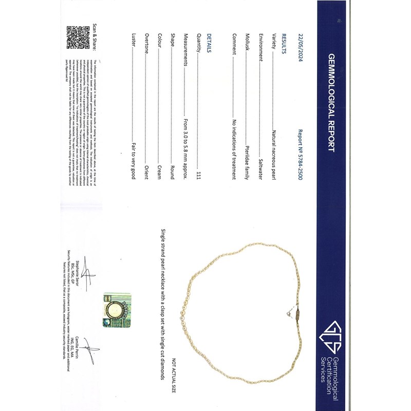 Accompanied by report number 5784-2500 dated 22nd May 2024 stating that the pearls graduate from 3.0 to 5.8mm and are natural saltwater