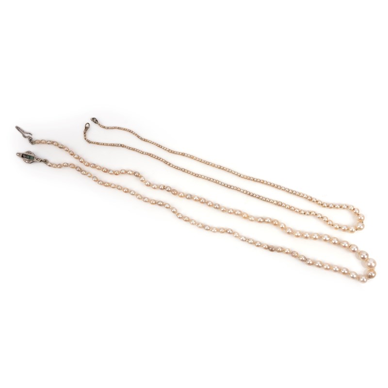 A single row natural pearl necklace, set with seed pearls and natural saltwater pearls, length 35cm, with a single-row cultured pearl necklace with an emerald and diamond clasp (one emerald missing)