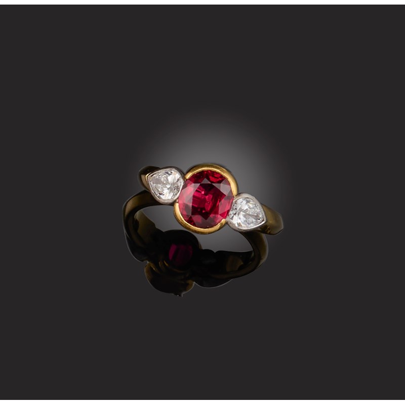 A ruby and diamond ring, set with an oval ruby weighing 2.72 carats, between shoulders set with pear-shaped diamonds, each weighing approximately 0.50 carats, mounted in 18ct gold, size R1/2, British hallmark