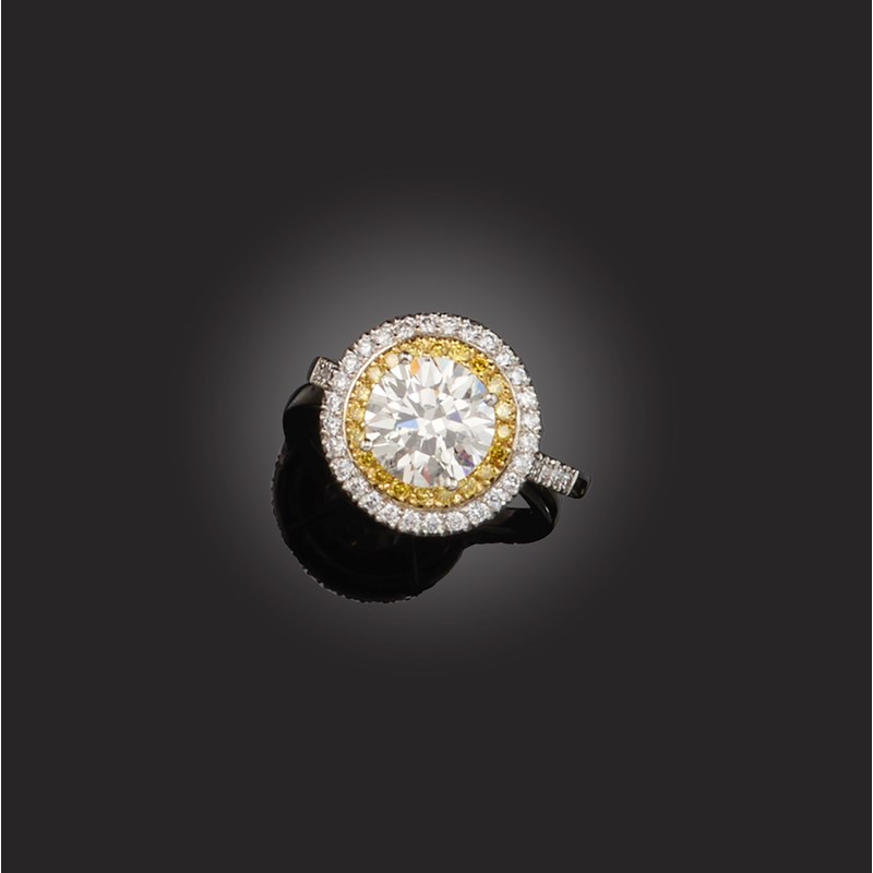 A diamond and yellow diamond ring, of cluster design, set with a brilliant-cut diamond weighing approximately 2.50 carats, within concentric borders of brilliant-cut diamonds and yellow diamonds, mounted in platinum and gold, size L1/2
