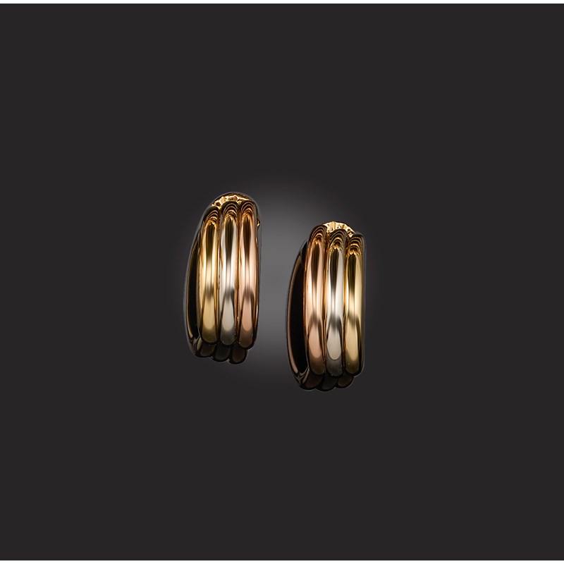 Cartier, a pair of earrings, 'Trinity de Cartier', 1990s, each designed as a fluted gold hoop with a tricoloured finish, length 2.3cm, clip and post fittings, signed Cartier, numbered D37859, copyright mark, dated 1995, Italian maker's marks, Swiss assay marks, pouch stamped Cartier