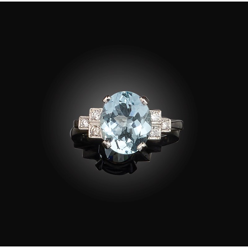 An aquamarine and diamond ring, set with an oval aquamarine weighing approximately 2.90cts, within