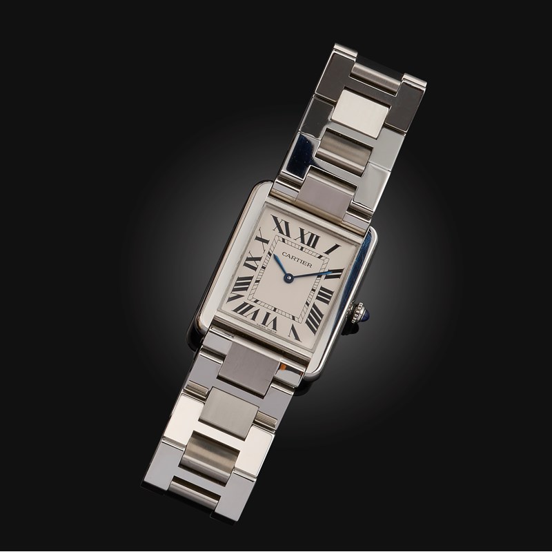 Cartier, a gentleman's stainless steel watch, 'Tank Solo', ref. 3169, rectangular signed white dial, Roman numeral indicators, secret signature at VII, synthetic sapphire winder, stainless steel case and integrated link bracelet with double deployant clasp, case width 2.6cm, signed Cartier, quartz movement, ref. 3169, case no. 771697UX