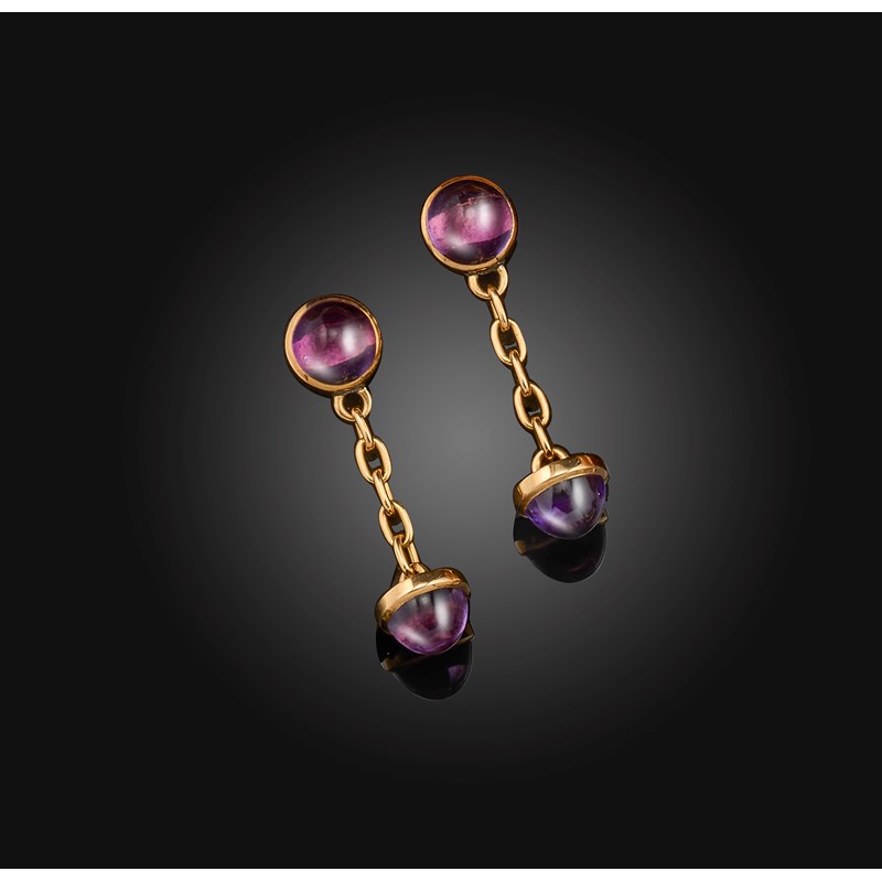 A pair of amethyst earrings, each composed of a cabochon amethyst suspending another from a section of chain linking, mounted in gold, length 4cm each, post fittings, converted from cufflinks