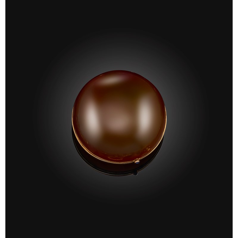 A carnelian and sapphire box, 20th century, of circular form in polished carnelian, the clasp set with a cabochon sapphire, mounted in gold, measuring 5.2 x 4.8 x 2.8cm, stamped 18K