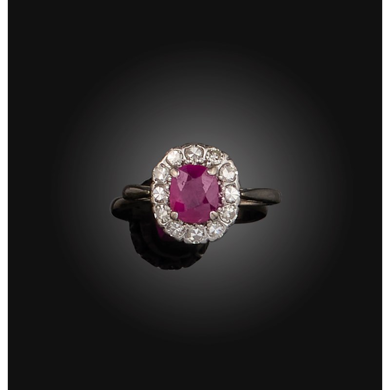 A ruby and diamond cluster ring, the cushion-shaped ruby set within a surround of single-cut