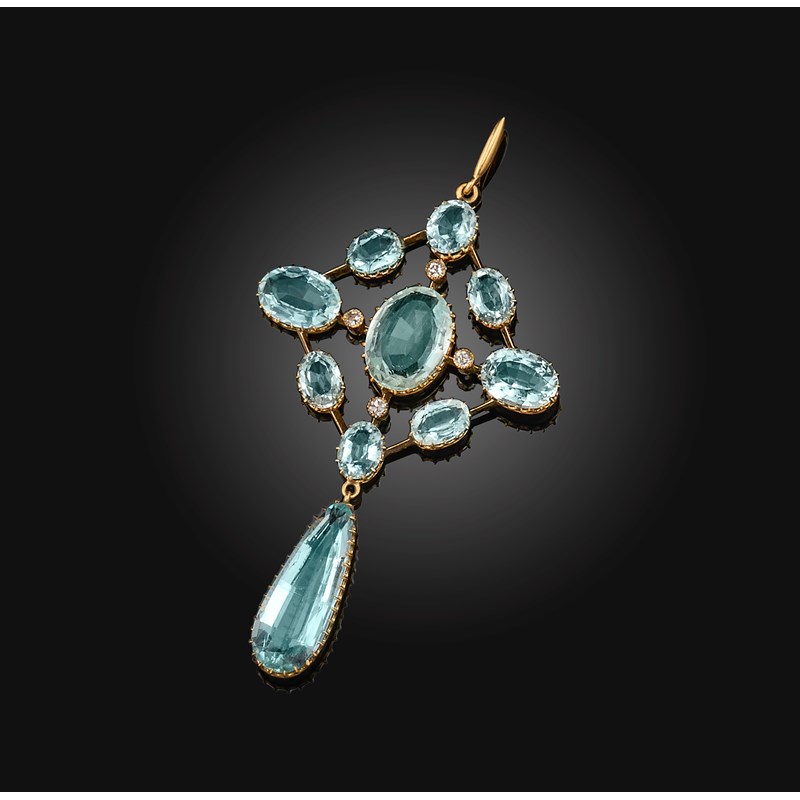 An aquamarine and diamond pendant, early 20th century, designed as a lozenge of knife wire construction, claw-set with oval aquamarines and circular-cut diamonds, suspending a pear-shaped aquamarine pendant, mounted in gold, length 7.4cm