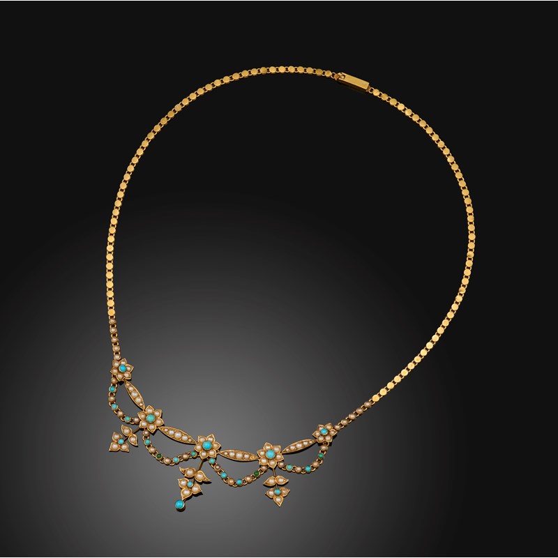 An Edwardian seed pearl and turquoise necklace, early 20th century, the front of festoon design, composed of flowers and foliate pendants set with turquoise cabochons and seed pearls, to a back chain of disc-shaped links, mounted in gold, length 41.5cm, length at front 2.9cm, stamped 15ct, fitted case stamped Jay's, Oxford Street