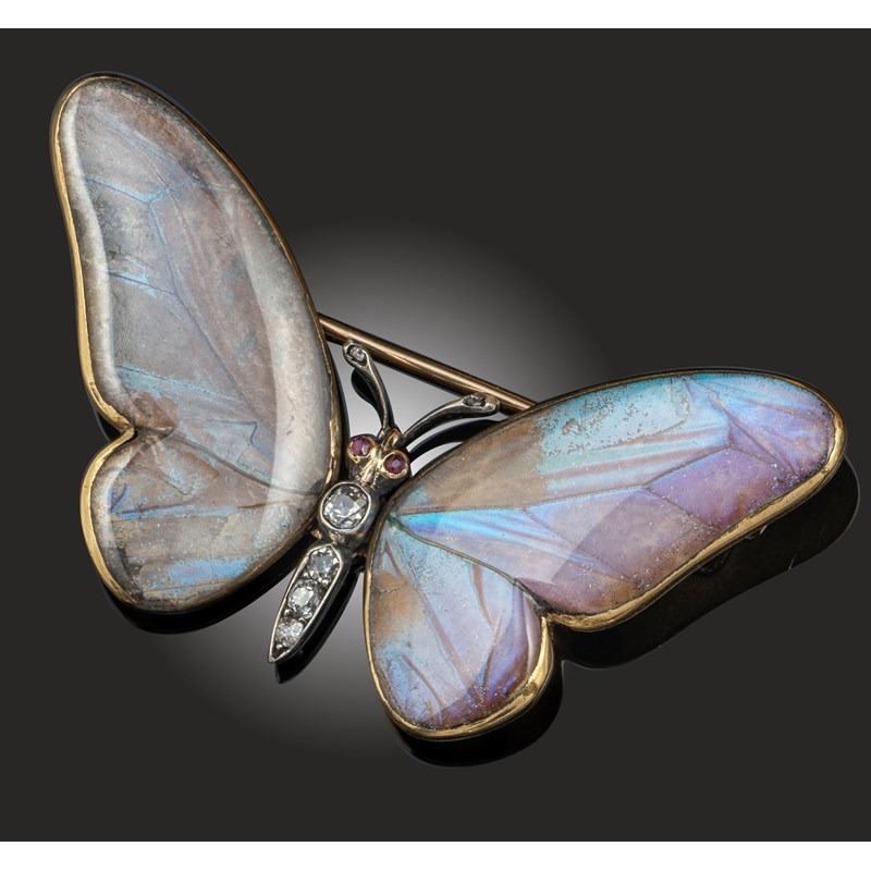 Palstcho, a rare butterfly wing, ruby and diamond brooch, circa 1920, designed as a butterfly, its wings composed of glazed compartments of iridescent butterfly wing, its body set with cushion-shaped diamonds, its eyes set with circular-cut rubies, wingspan 5.8cm, maker's mark EP for Palstcho, Austro-Hungarian assay mark for 14ct gold, Vienna, and French import assay marks for 14ct gold, French patent inscription