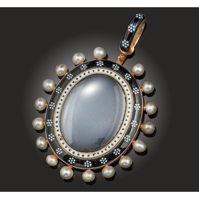 A late Victorian enamel and pearl locket pendant, circa 1879, the frame decorated with black and white enamel within a border of pearls mounted in yellow gold, the reverse with the inscription 'Good Friday 1879', pearls untested, length including bail 4.7cm, one pearl lacking, fitted case