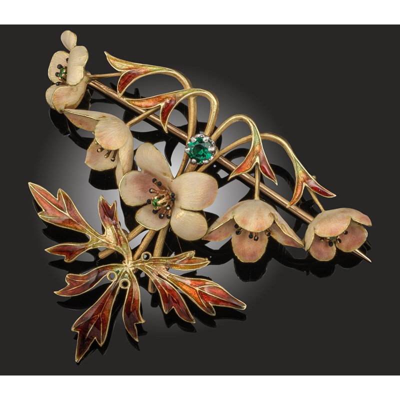 Henri Dubret, a French Art Nouveau enamel brooch pendant, depicting stylised dogwood blossom in polychrome enamel and set with a green tourmaline in yellow gold, maker's mark and French control marks for 18ct gold, detachable brooch fittings, length 5cm