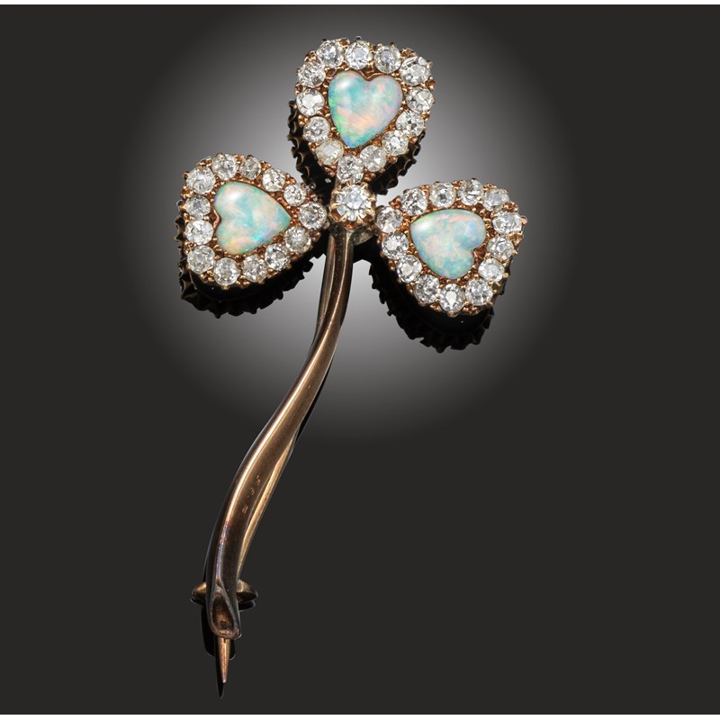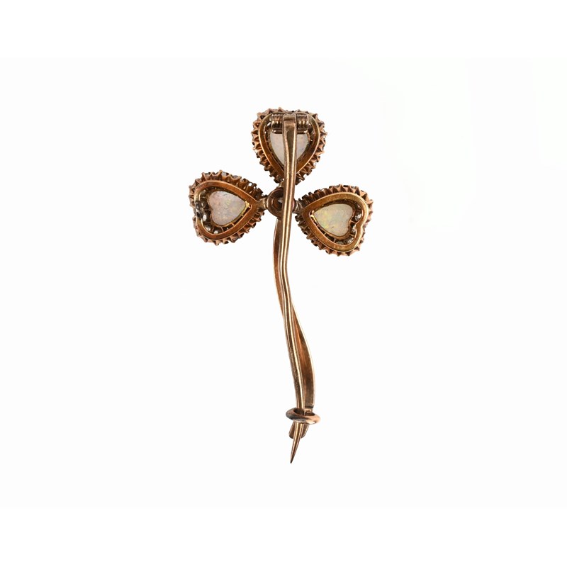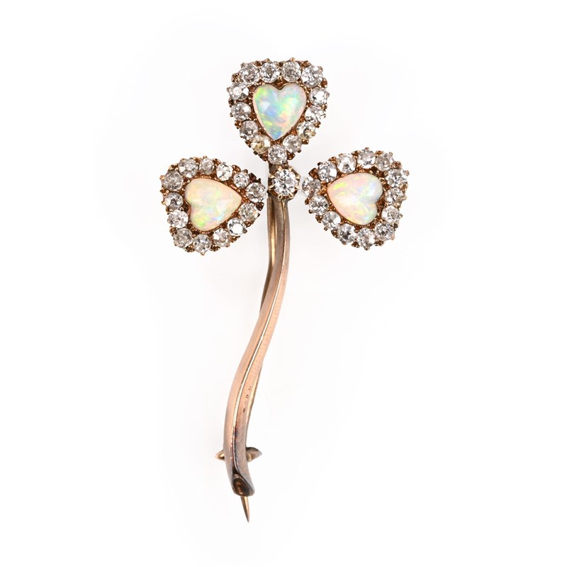 An Edwardian opal and diamond shamrock brooch, set with heart-shaped opals within diamond borders in yellow gold, length 4.5cm