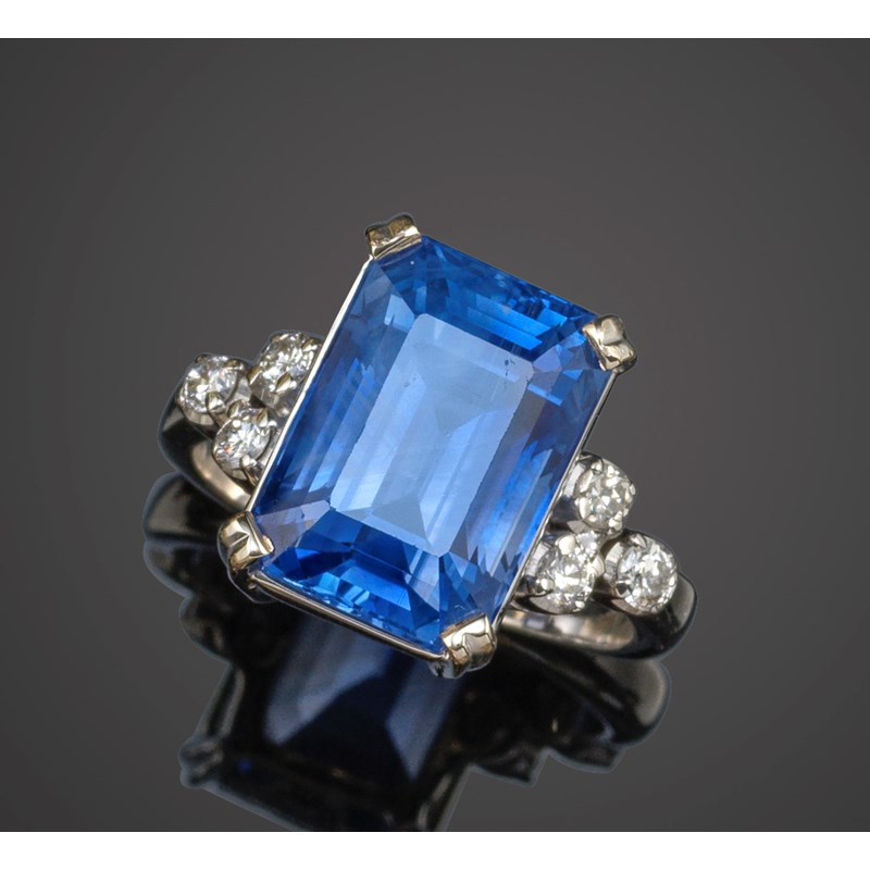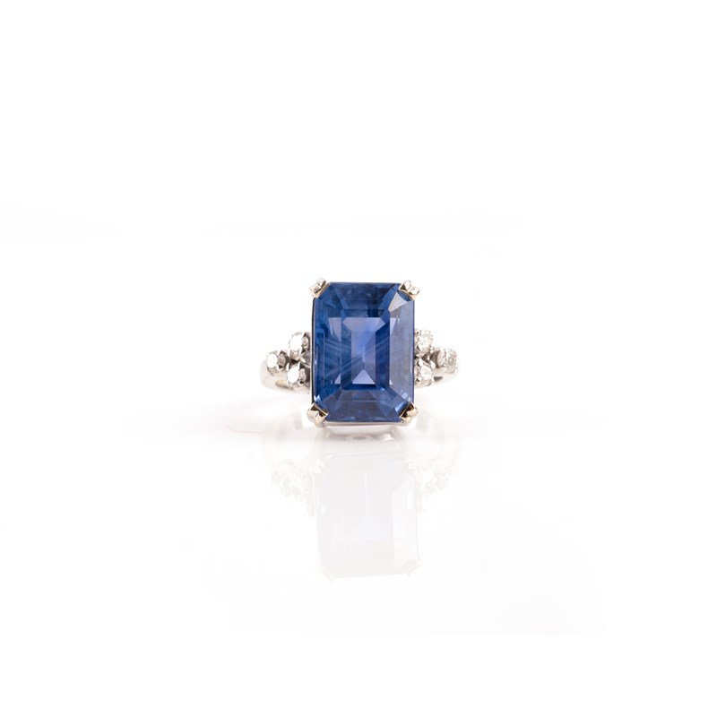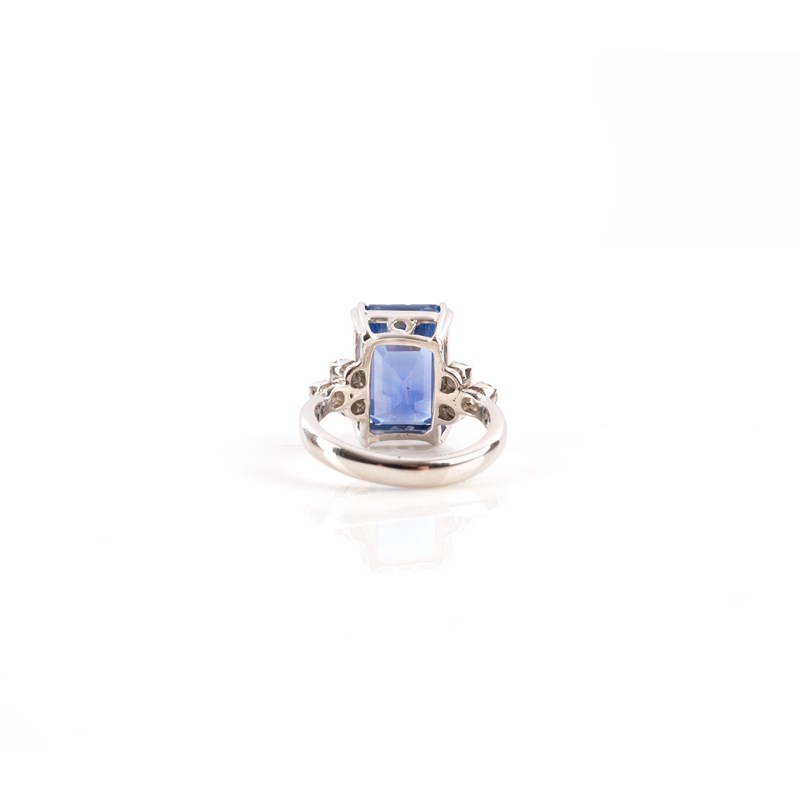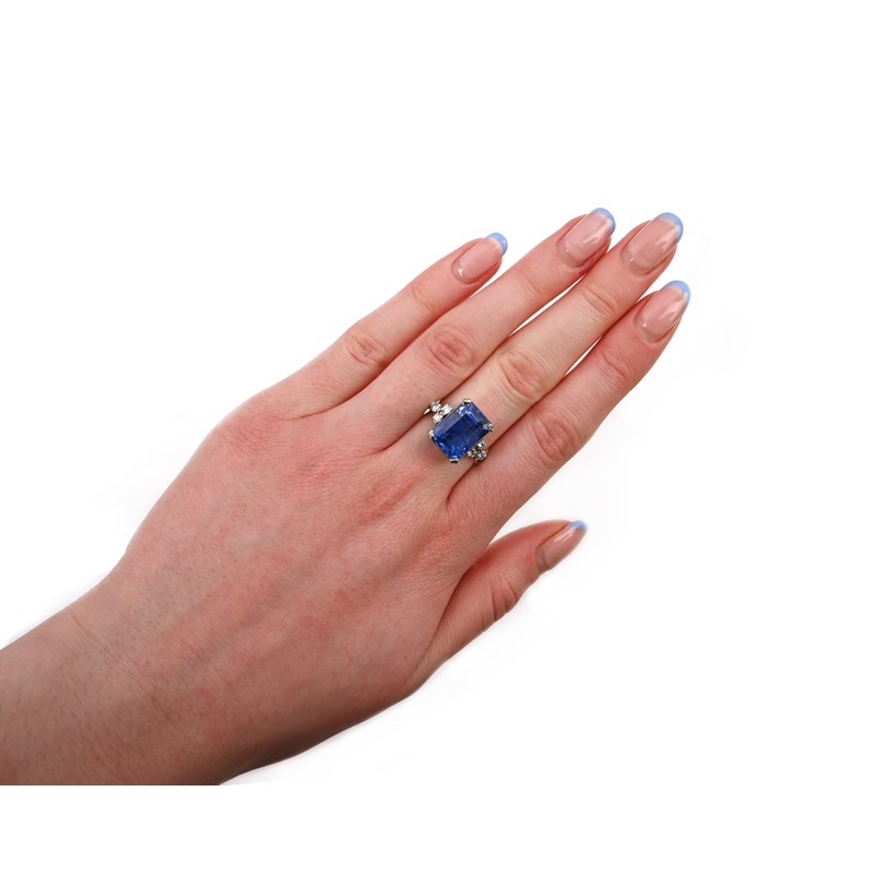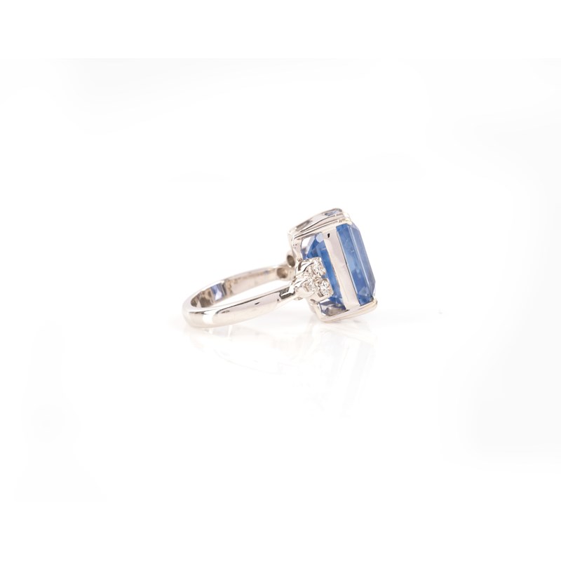 A sapphire and diamond ring, the emerald-cut sapphire weighing 14.10cts, claw set above shoulders, each set with round brilliant-cut diamonds to a white gold shank, stamped 750, size N