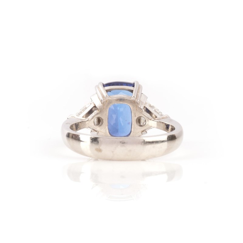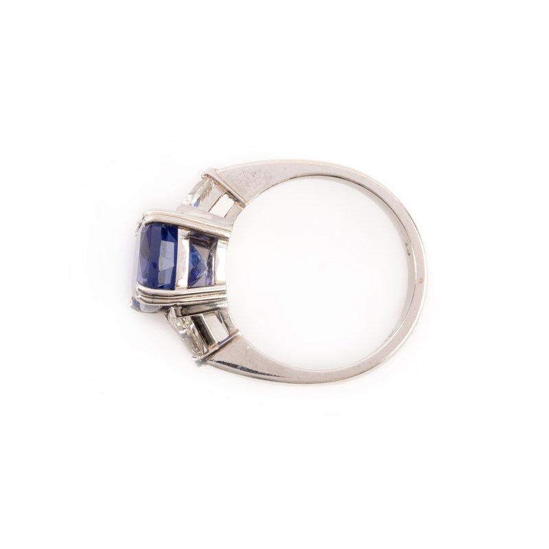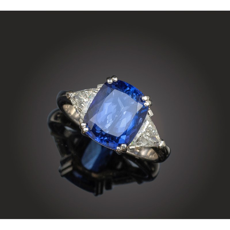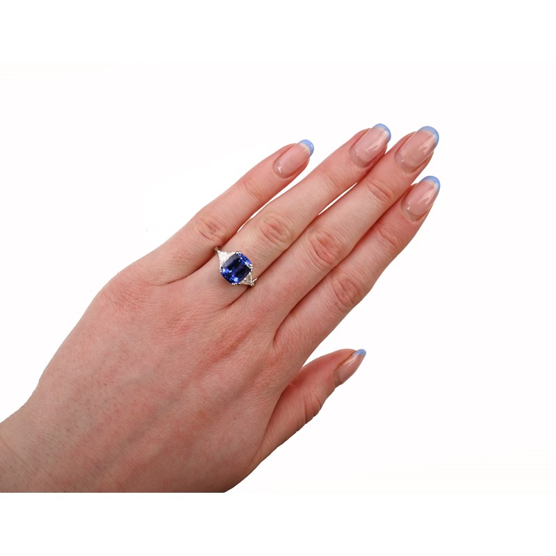 A tanzanite and diamond three stone ring, the cushion-shaped tanzanite flanked with triangular-shaped diamonds in platinum, size M