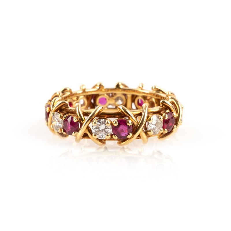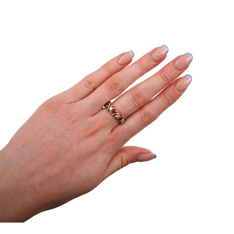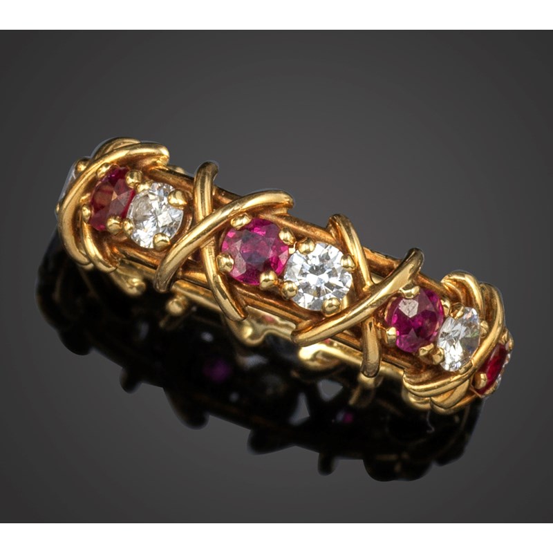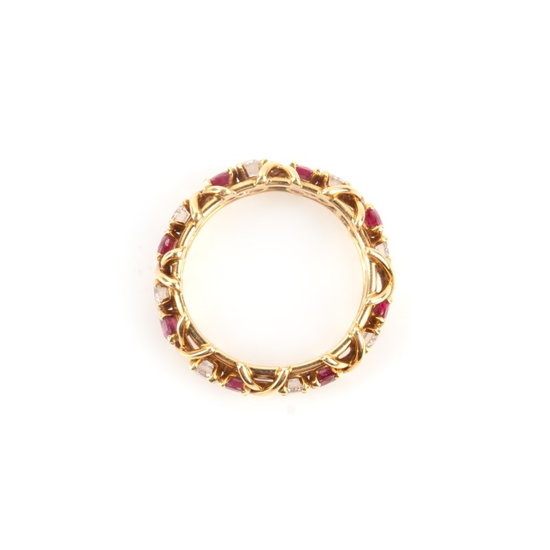 A ruby and diamond eternity ring, circa 1969, alternately-set with pairs of circular-cut rubies and diamonds separated by gold X's, London hallmarks for 18ct, 1969, size R