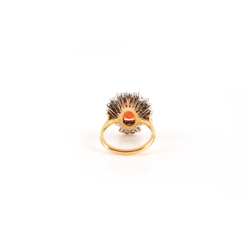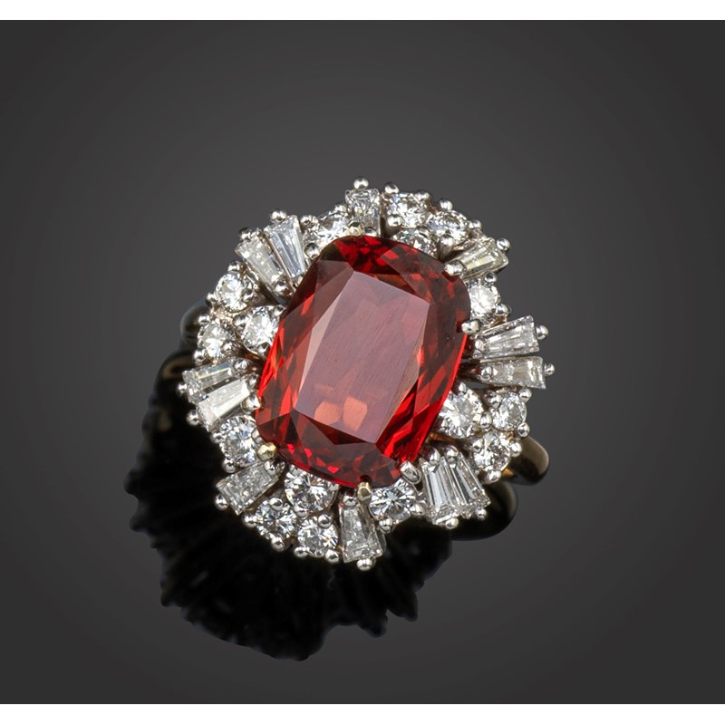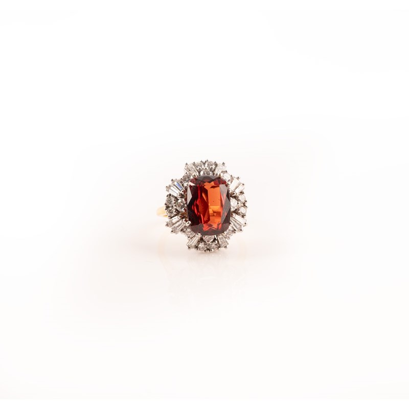 A garnet and diamond cluster ring, the cushion-cut garnet within a ballerina surround of tapering baguette-shaped and graduated round brilliant-cut diamonds mounted in white gold to a yellow gold shank, stamped 18K and 14K, size L 1/2