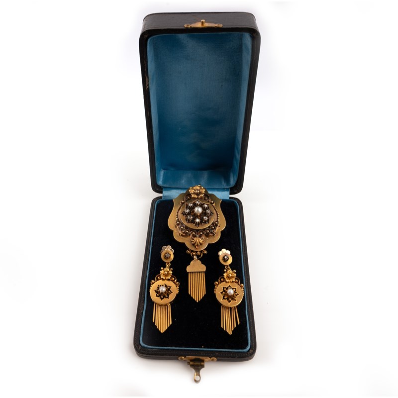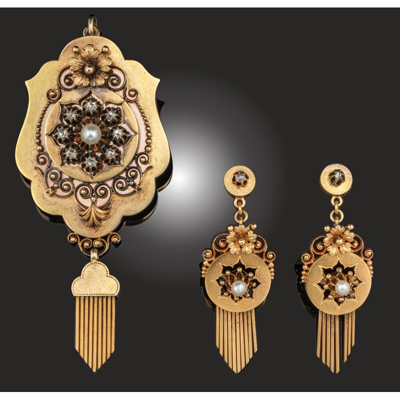 A Swedish 19th century cased demi-parure, comprising a gold brooch, set with a central pearl within rose-cut diamond surround, foliate scroll decoration, locket compartment to reverse, suspending a tassel with a conforming pair of earrings with later fittings, Swedish marks to penant catch, pendant 3.5cm wide