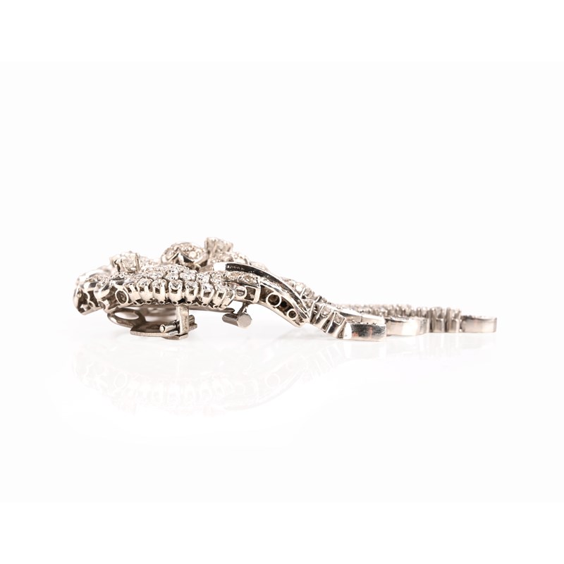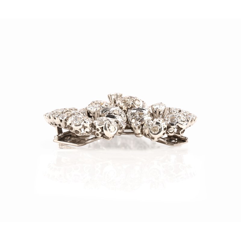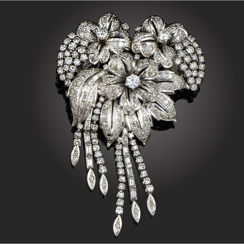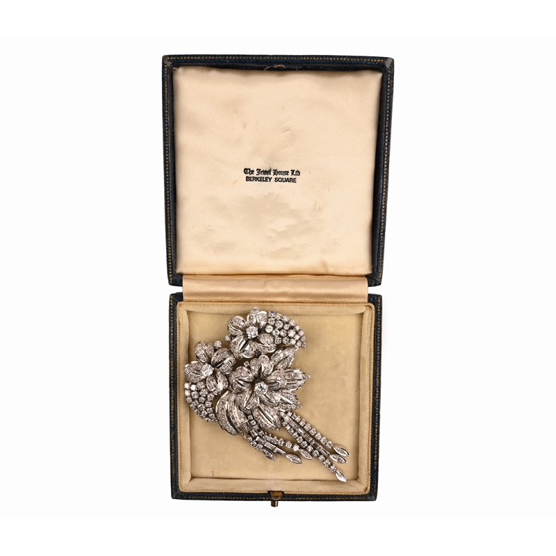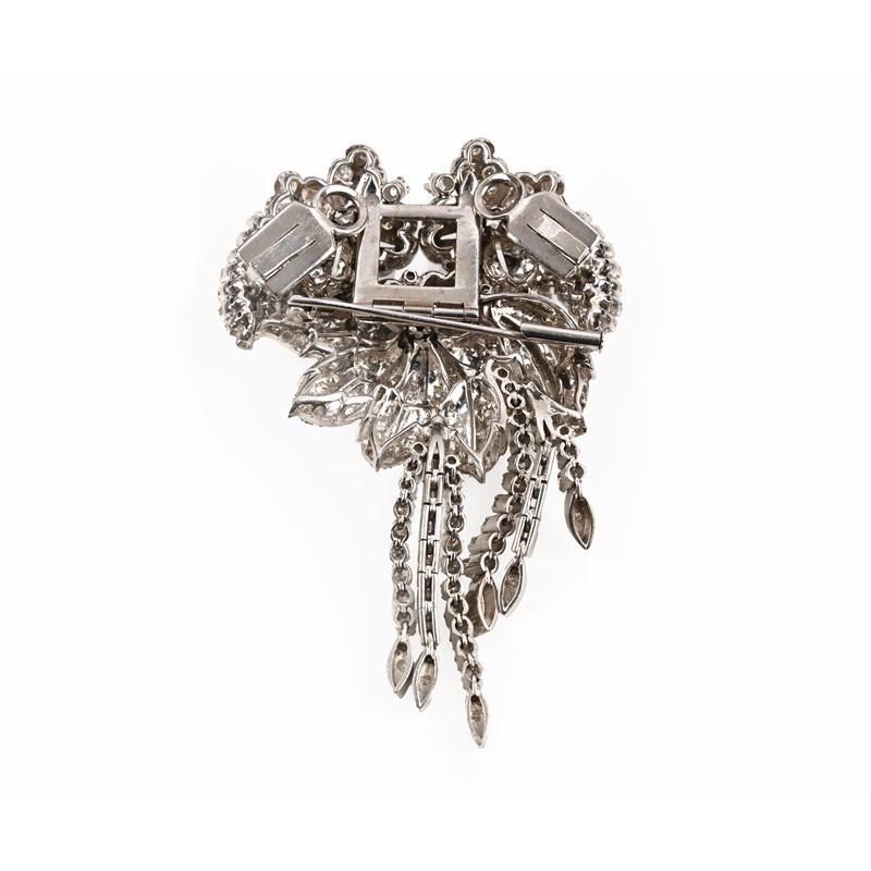 A diamond brooch/earrings, of floral design set with round brilliant-cut and baguette-shaped diamonds, the cental flowerhead above a spray of leaves suspending articulated drops, below two flowerheads detaching to form earrings in platinum, clip fittings to integral earrings, overall length 8cm, earring length 3cm, case