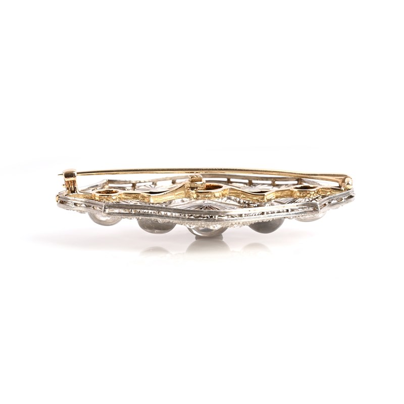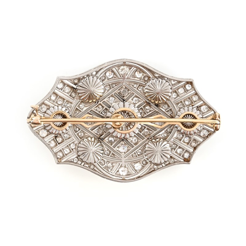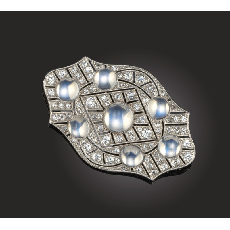 An Art Deco diamond and moonstone brooch, circa 1920, the circular moonstone cabochons set in a cartouche-shaped frame pierced with a geometric motif and millegrain-set with old circular-cut diamonds in platinum to a yellow gold pin, length 5.3cm