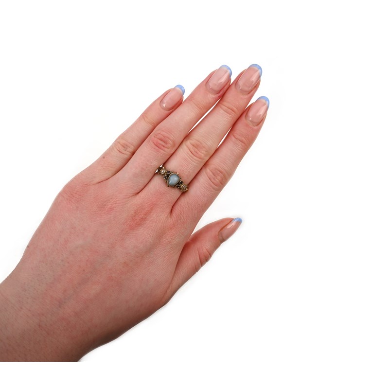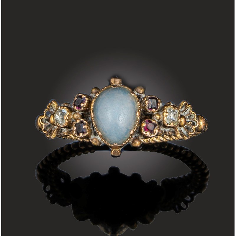 A Regency gold and enamel ring, circa 1830, centring on opaline glass, within ruby and diamond shoulders and carved shells decorated with enamel (damaged) on pellet-work band, locket compartment to reverse, size N