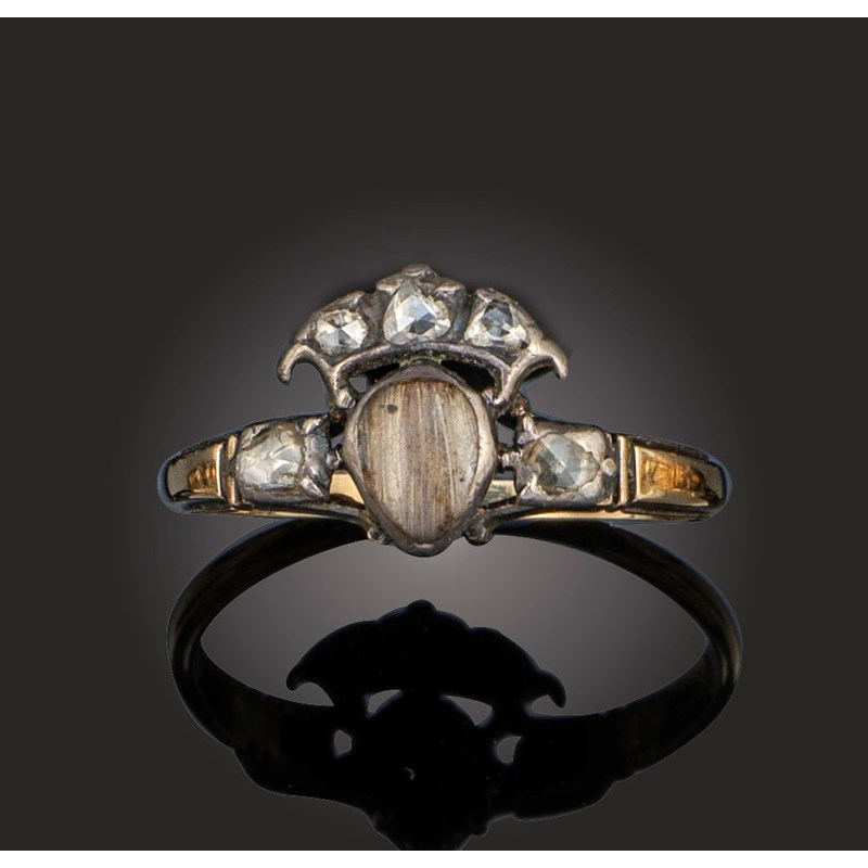 An early 19th century hairwork and diamond ring, centring on a hairwork locket beneath diamond coronet, within diamond shoulders in silver and gold, size N 1/2
