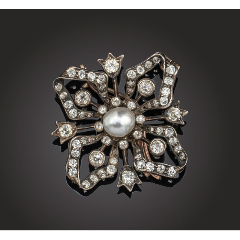 An Victorian pearl and diamond brooch pendant, late 19th century, the openwork ribbon-tie design set with graduated old-cut diamonds and centred with a pearl in silver and gold, retractable bail, pearl untested, width 2.7cm
