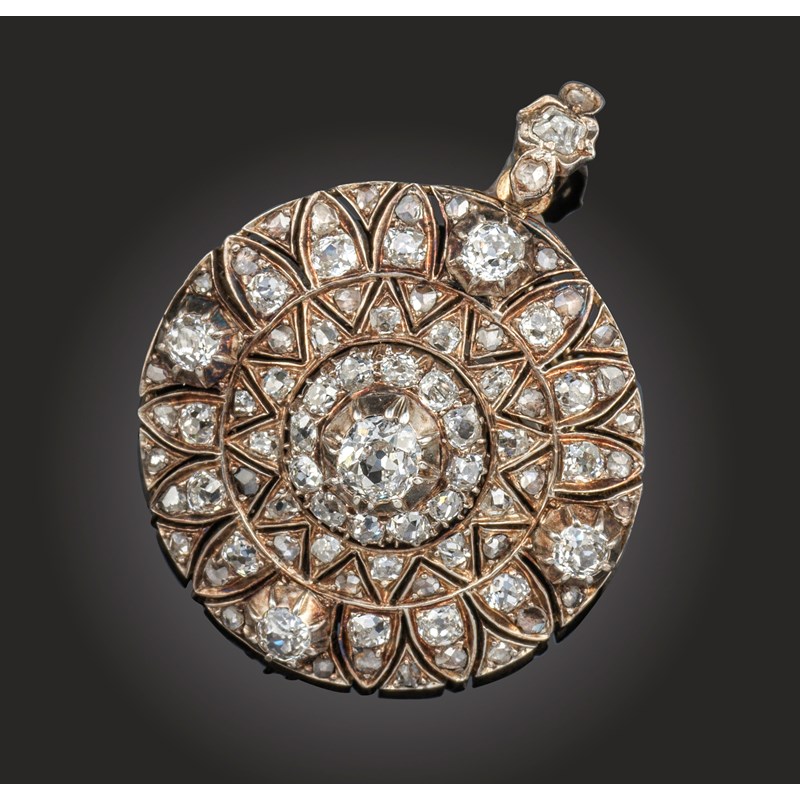 A late Victorian diamond brooch, circa 1890, of target design, centered with an old cushion-cut diamond within a geometric openwork surround set with rose-cut and circular-cut diamonds and four old cushion-cut diamonds to the outer register, mounted in silver and gold with a detachable bail and brooch fitting, diameter 3.2cm, case