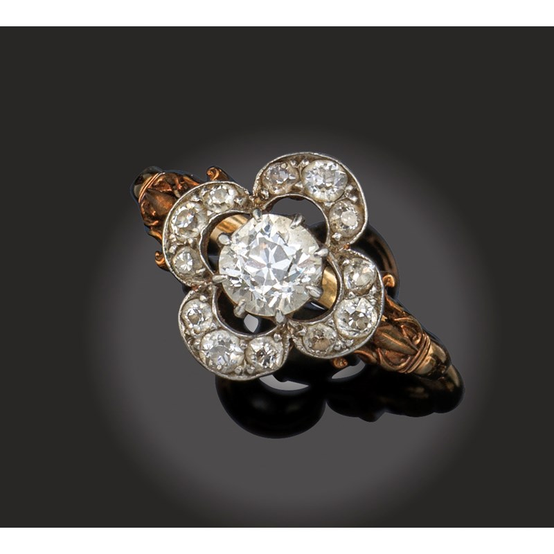 A late Victorian diamond cluster ring, the old circular-cut diamond weighing approximately 0.75cts, within an openwork quatrefoil surround set with graduated circular-cut diamonds, mounted in silver and gold, stamped 18ct, size S, case