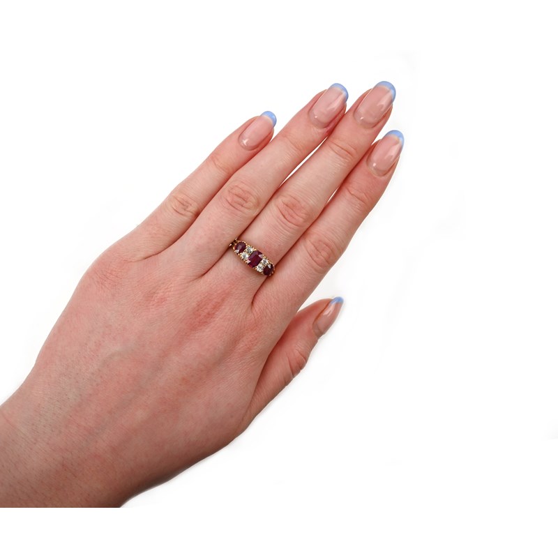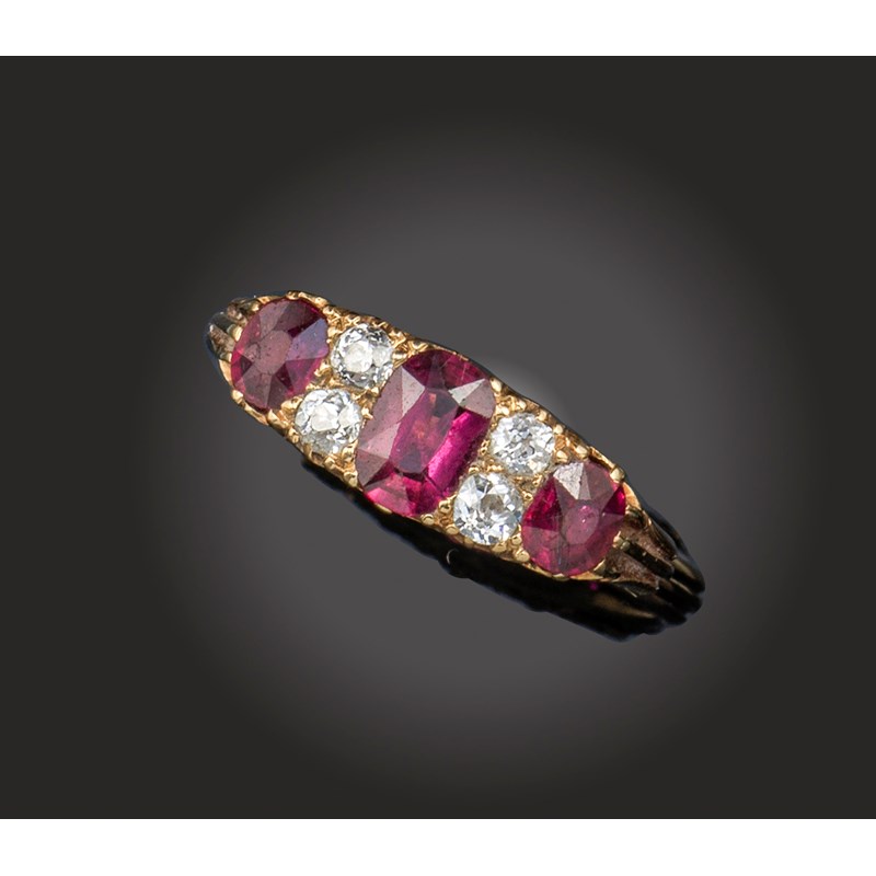 A late 19th century ruby and diamond half-hoop ring, set with graduated cushion-shaped rubies separated with pairs of old circular-cut diamonds in carved and pierced yellow gold setting, size P 1/2, case