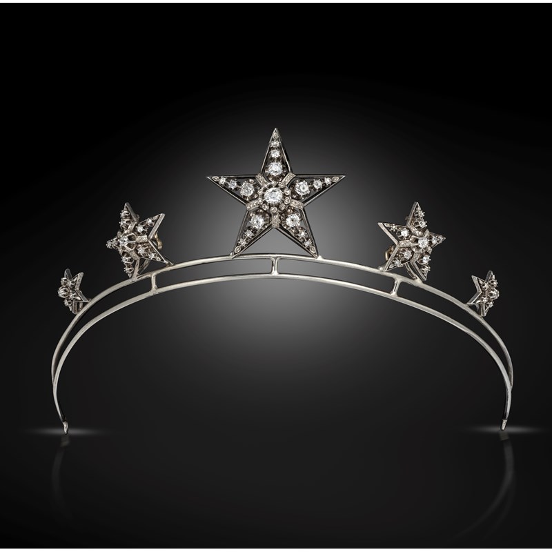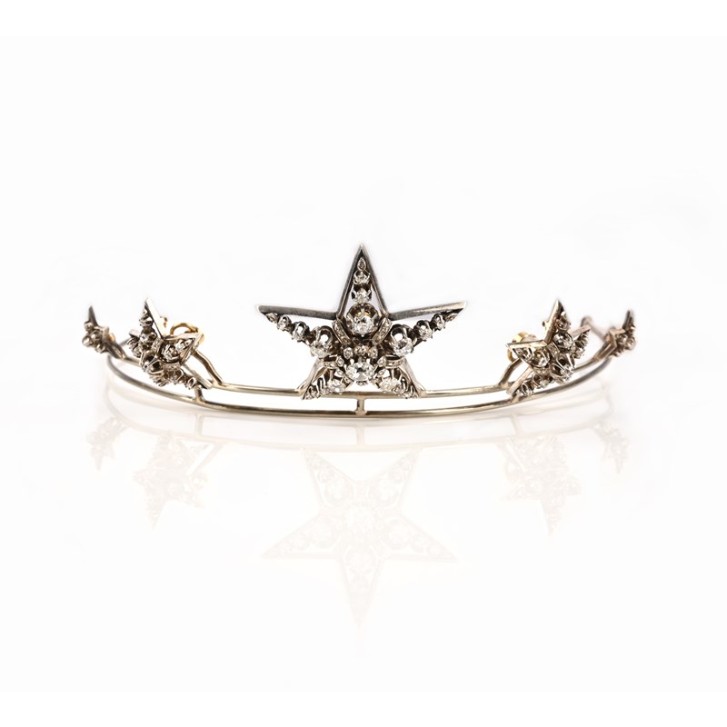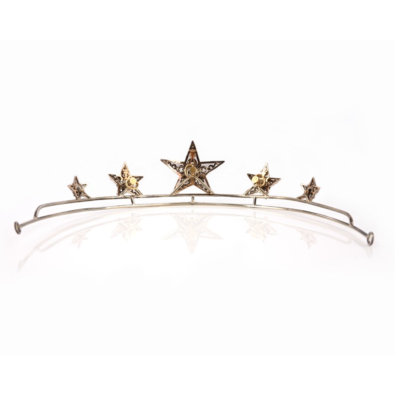 A diamond-set star tiara, late 19th century and later, designed as a band of graduted 19th century stars set with old circular-cut and cushion-cut diamonds, mounted in silver on gold, the central three stars detachable and converting to pendants, on a later silver tiara frame, tiara inner curve 28cm, height at centre 5.4cm, central star length 4.5cm
