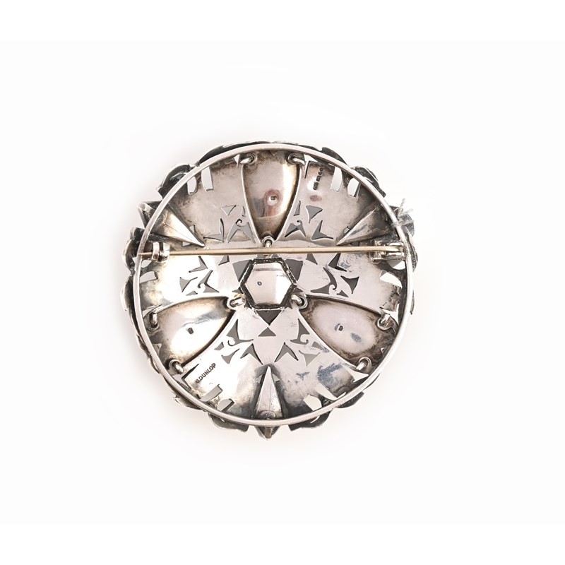 The Scottish jewellery designer Sibyl Dunlop (1889-1968) first opened her workshop in Kensington High Street, London, in 1920. Here, she became known for her distinctive style in jewellery, complemented by her bohemian dress of Middle Eastern caftans and Russian boots. Though the acme of the Arts & Crafts movement was waning by this date, Dunlop continued to work in the style, her designs characterised by dense geometric patterns of cabochons known as 'carpet of gems'. Dunlop typically made use of semi-precious stones such as chalcedony and opal, which she juxtaposed with amethyst and other precious stones, to create the vibrant colour palette for which her pieces are known. Worked by lapidaries in the German gem-cutting centre of Idar-Oberstein, the stones were then set by the craftsmen in Dunlop's London workshop, who created jewellery out on the shop floor for clients to see, very much in the spirit of the Arts & Crafts movement. Her principal craftsman and manager was W. Nathanson, with whom she collaborated until the outbreak of the Second World War in 1939. Following the war, it was Nathanson who continued the business due to Dunlop's poor health, and production continued until his retirement in 1971.