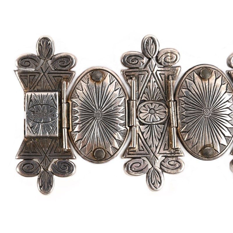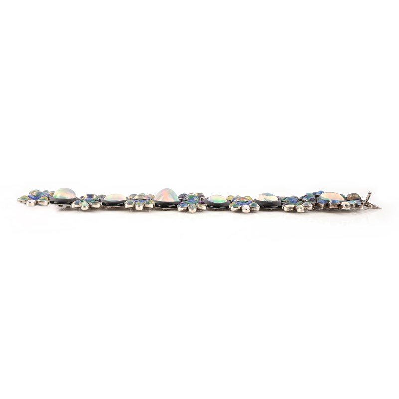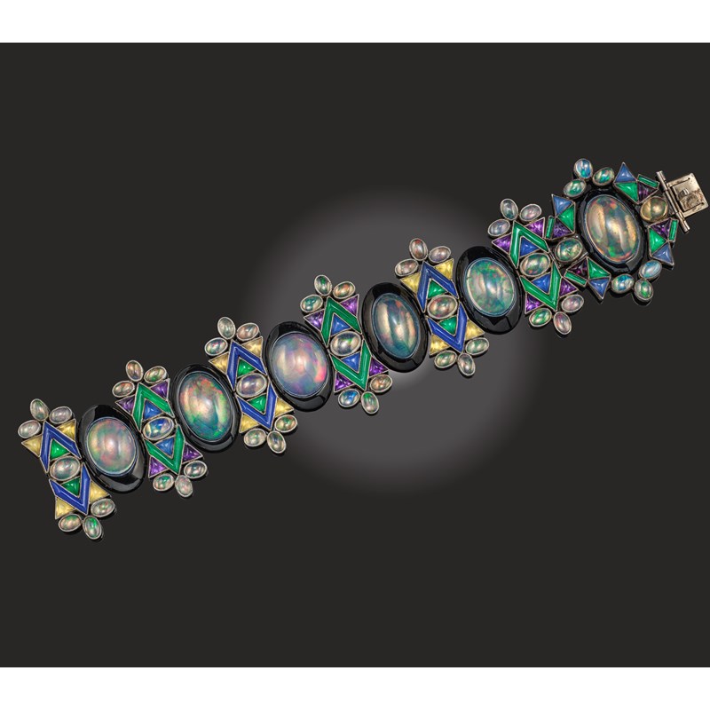 Sibyl Dunlop, an Arts & Crafts multi-gem and enamel bracelet, 1930s, in the 'carpet of gems' design, formed of oval cabochon opals framed in black enamel, alternating with geometric bands of opal, amethyst and blue, green and yellow chalcedony, ending in a large enamel-framed opal within a geometric border of amethyst, opal, and blue and green chalcedony, mounted in silver, the reverse engraved with a foliate design, signed S DUNLOP LONDON W8, length 19cm
