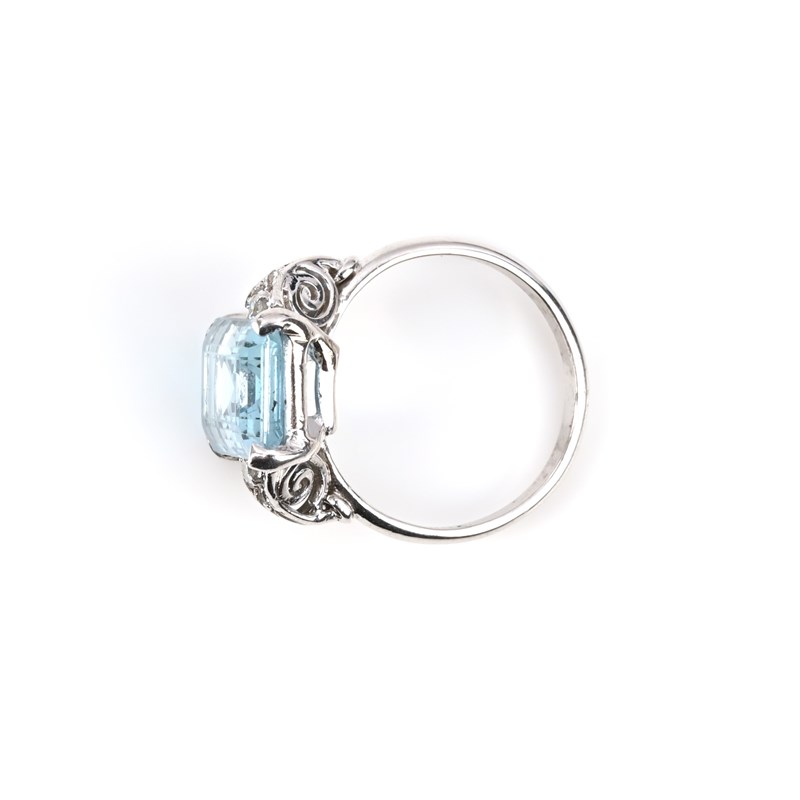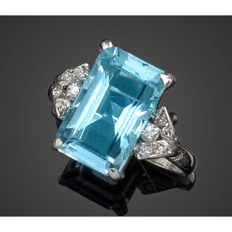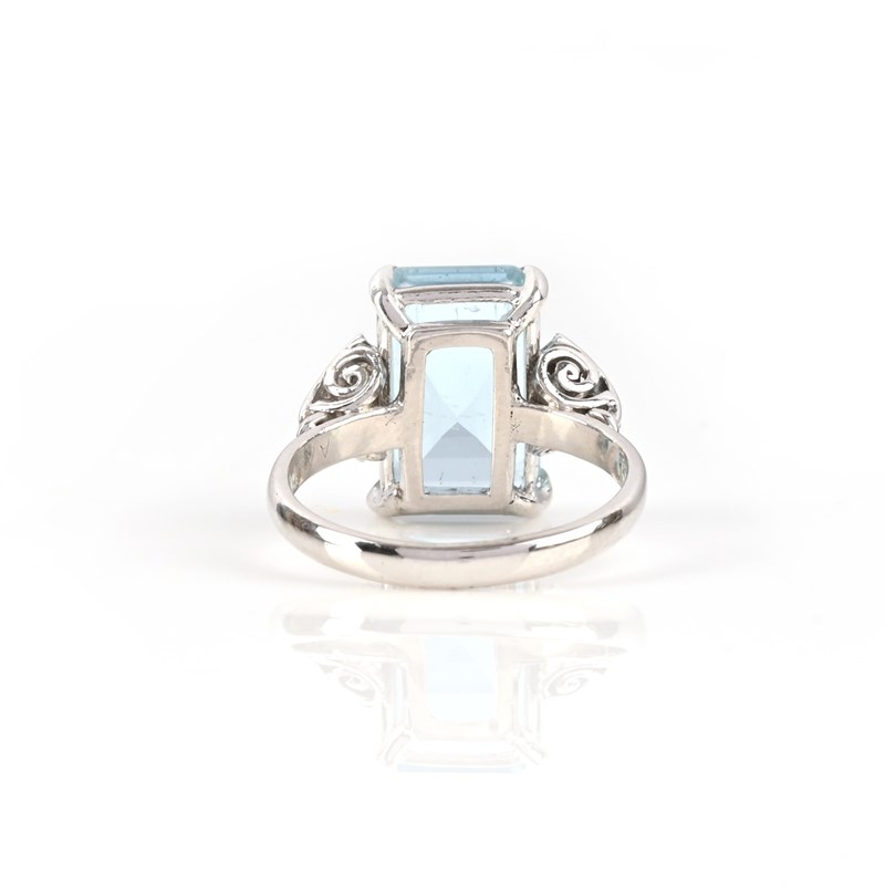 An aquamarine and diamond ring, the step-cut aquamarine claw-set above foliate shoulders accented with diamonds in white gold, stamped 750, numbered AA 17518, size K 1/2