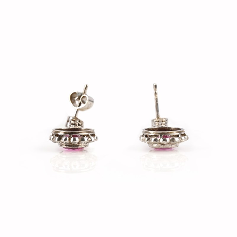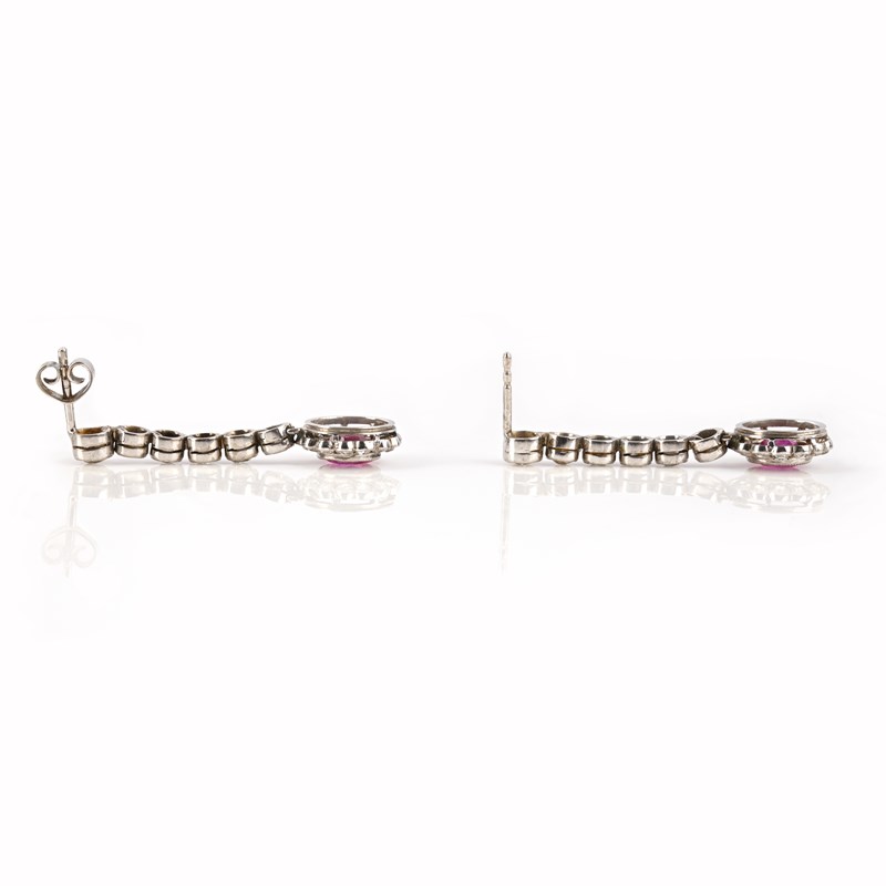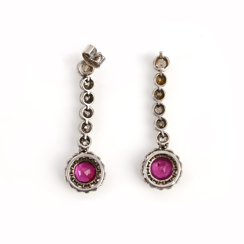 A pair of Edwardian ruby and diamond drop earrings, early 20th century, the circular-cut rubies weighing approximately 1.30cts each, within a frame of single-cut diamonds suspended from a row of old circular-cut diamonds in white gold, post fittings, length 3.6cm, one butterfly lacking