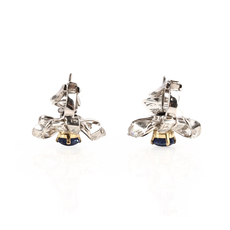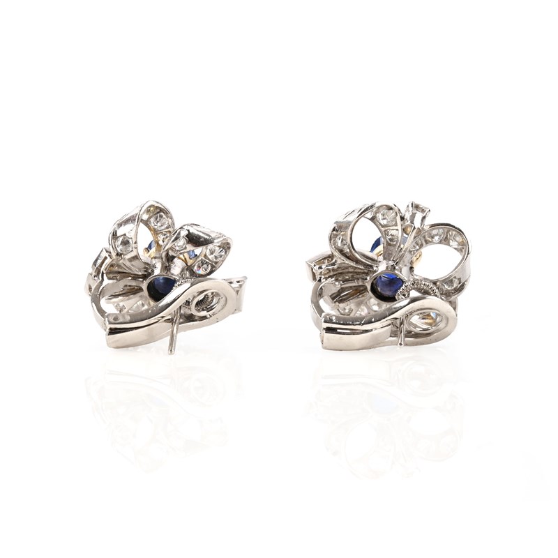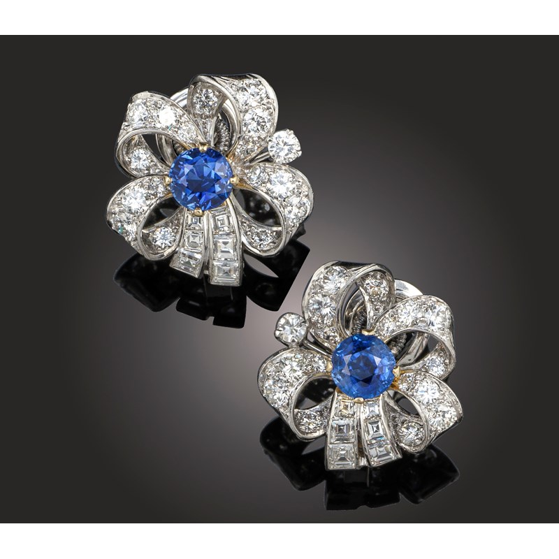 A pair of sapphire and diamond earrings, the circular-cut sapphires weighing 1.80cts and 1.46cts claw set in yellow gold, each to a ribbon-tie surround of round brilliant-cut and calibré-shaped diamonds in white gold, clip and post fittings, stamped 750, width 2.2cm