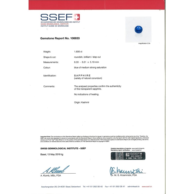 Accompanied by SSEF report number 106833 dated 13th May 2019 stating that the sapphire weighing 1.806cts shows no indication of heat treatment, origin: Kashmir