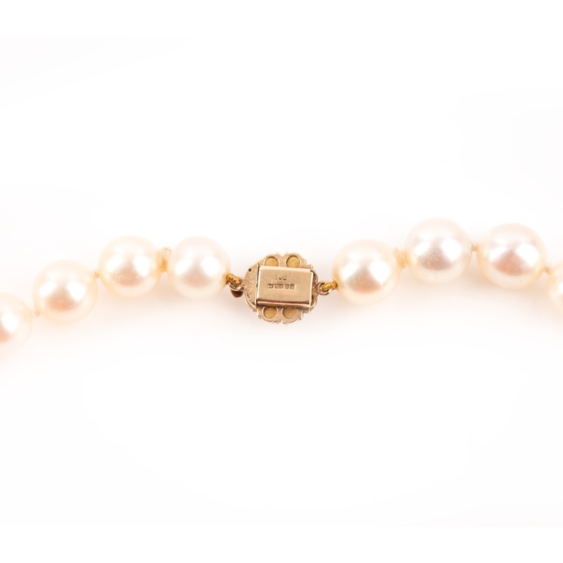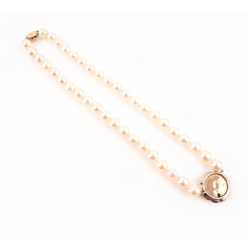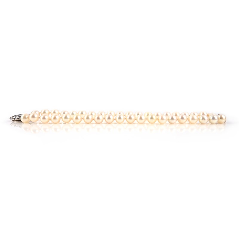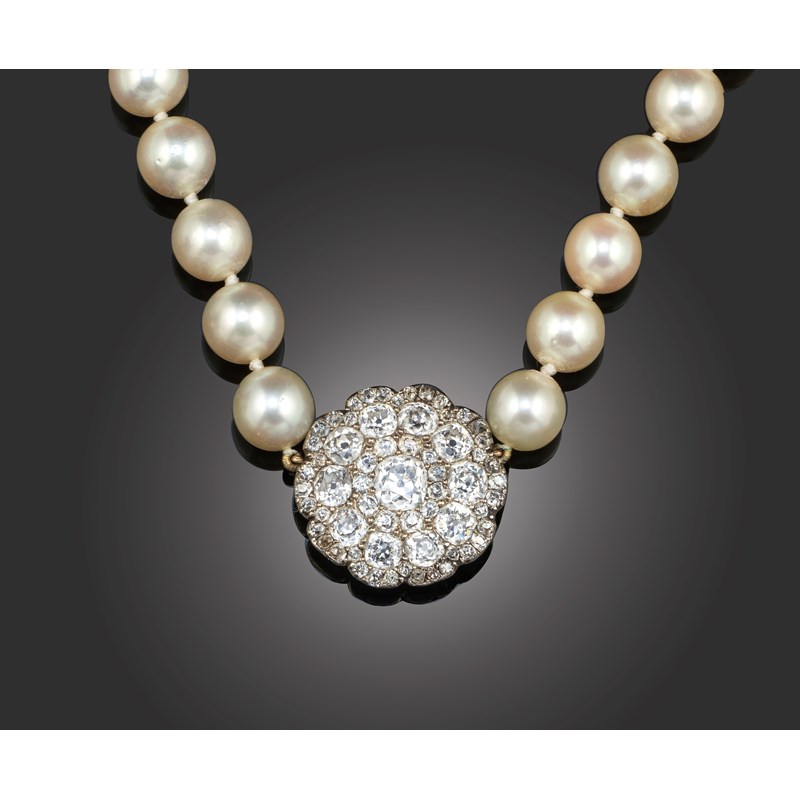 A cultured pearl and diamond necklace, composed of a single strand of cultured pearls measuring 9mm diameter, centred with a converted late 18th century clasp decorated with old cushion-shaped diamonds set in silver, to a 9ct gold and pearl clasp, British hallmarks to gold and pearl clasp, length 48.5cm