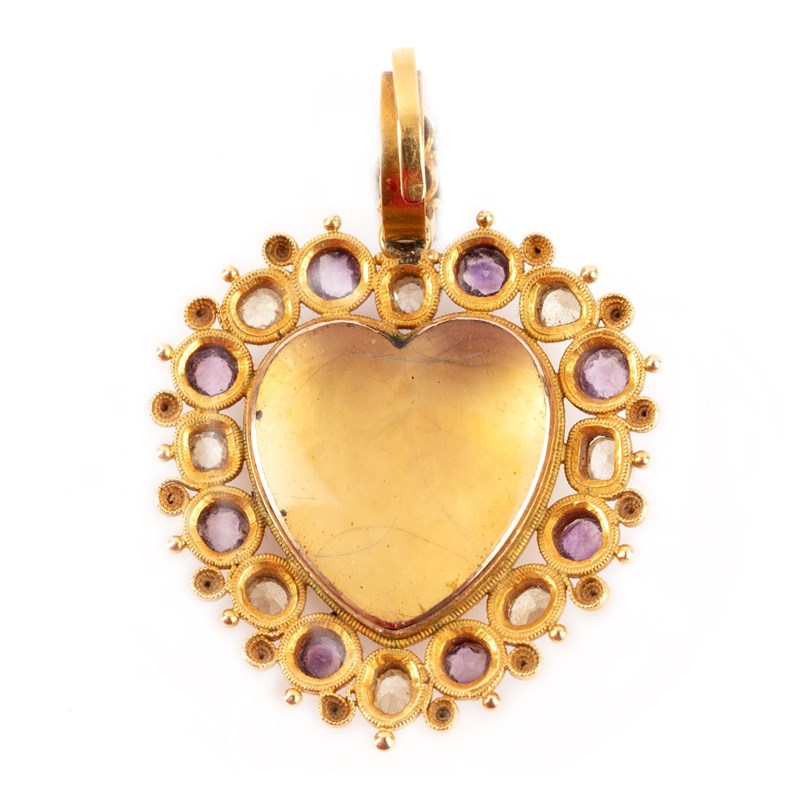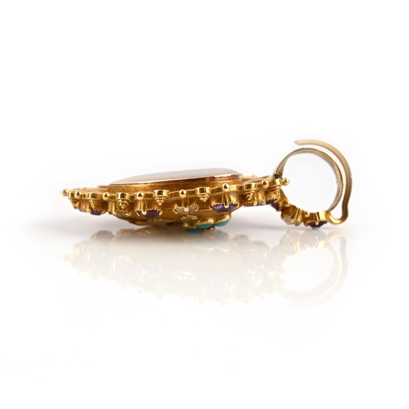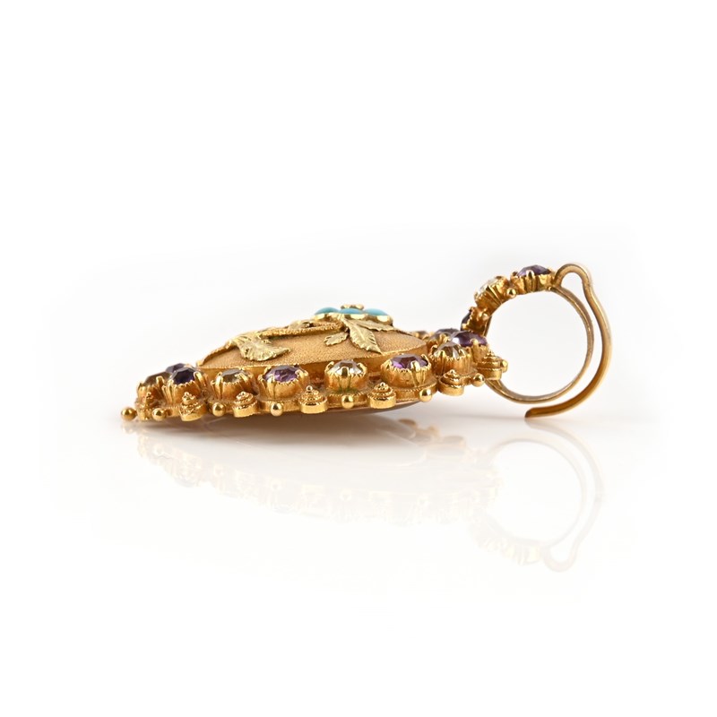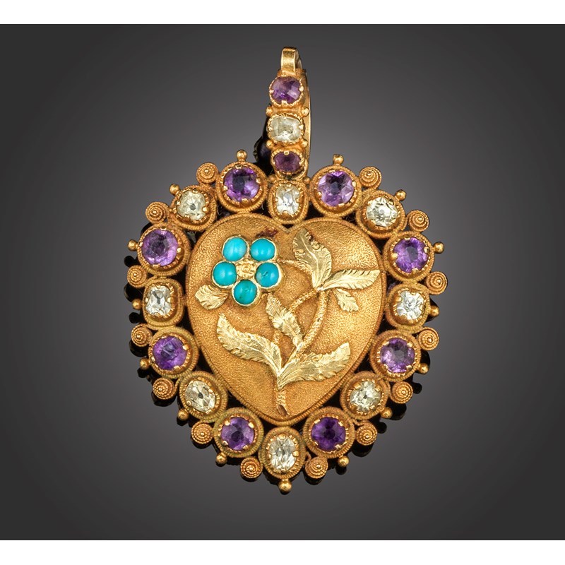 A Regency multigem-set gold pendant, of heart shaped design, the central forget-me-not motif set with turquoise cabochons, within a border of chrysolites and amethysts in gold filigree surrounds below a conforming bail, glazed locket compartment to the reverse, length 3.8cm