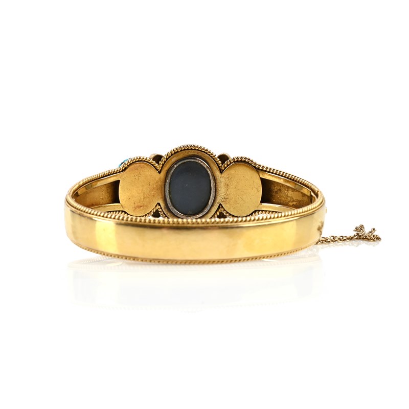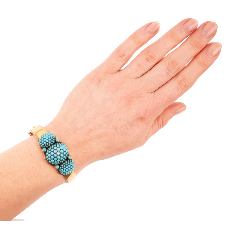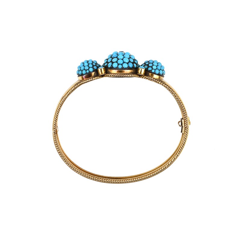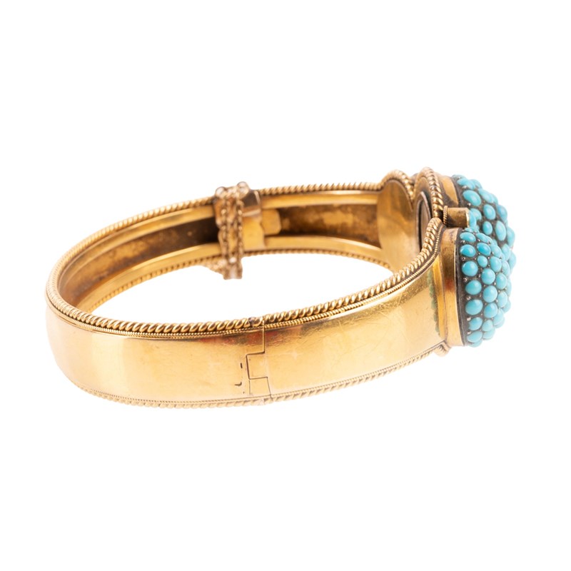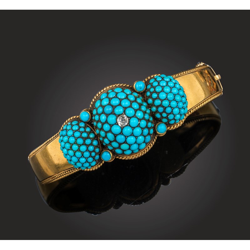 A Victorian gold and turquoise bangle, the three bombé panels pavé-set with turquoise cabochons, one with a central diamond, mounted on polised yellow gold bange with twisted rope borders, glazed locket compartment to the reverse, inner circumference 16cm