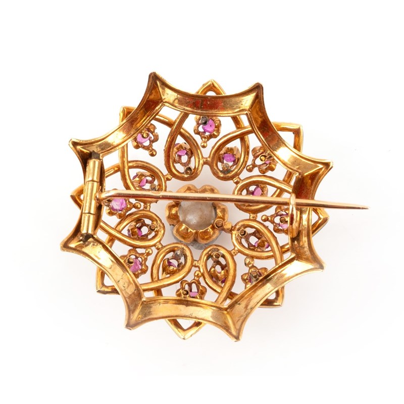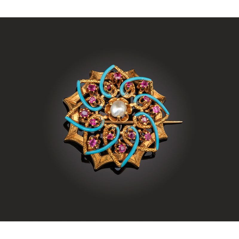 A mid 19th century enamel and gem-set brooch, centred with a pearl within a border of interlocking hearts detailed with blue enamel and set with rubies in yellow gold, French control marks and rubbed maker's lozenge, length 3.8cm, pearl untested, case