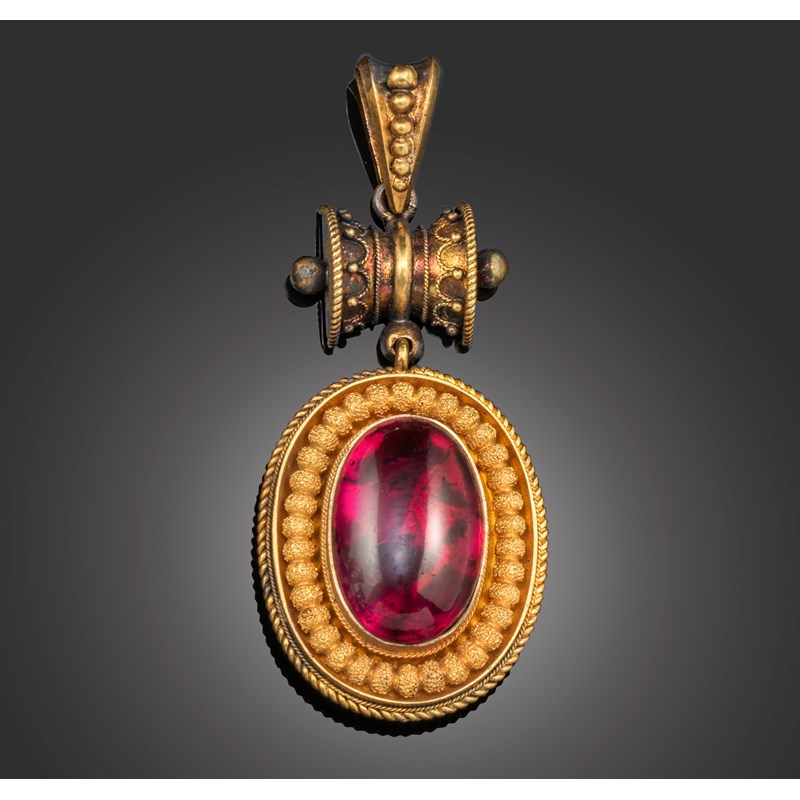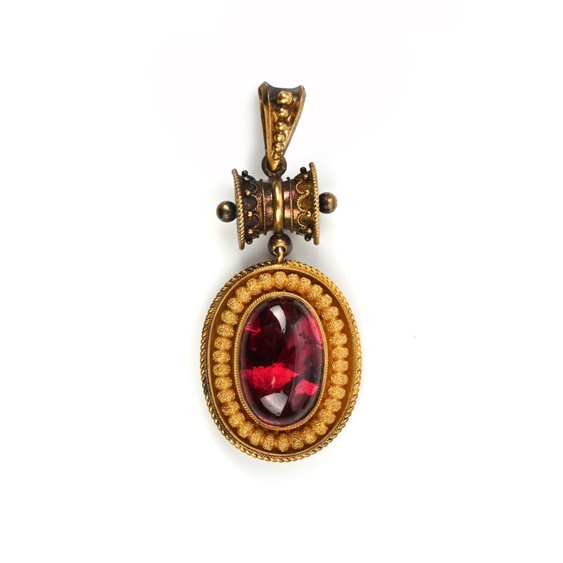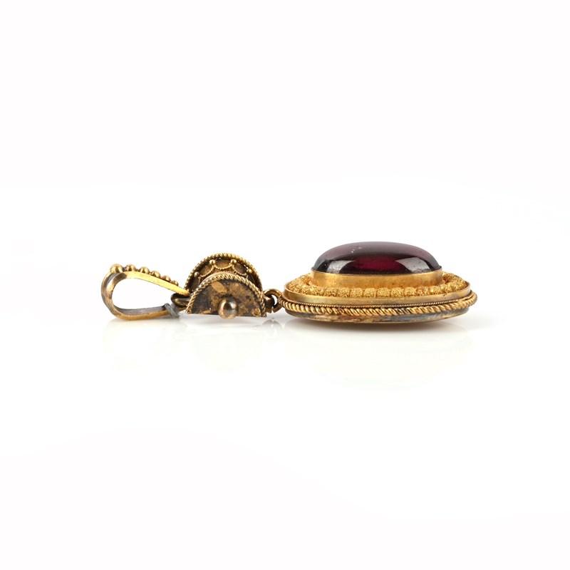 An Etruscan Revival garnet pendant, circa 1900, the oval garnet cabochon set within granulated and twisted rope surrounds, suspended from gold bail with pellet decoration and a waisted yellow gold link, length 4.4cm